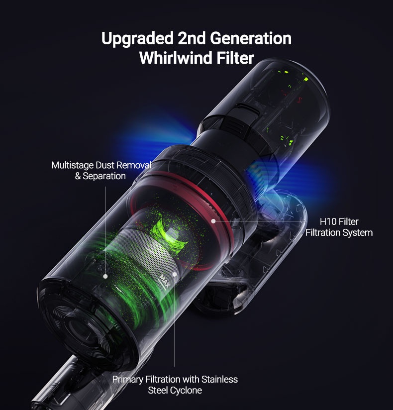 - Multi-stage cyclone separation system, silent large design wheels, providing a more efficient cleaning effect.