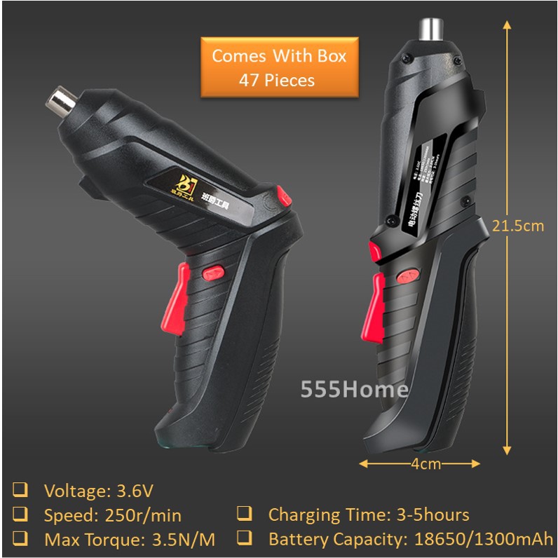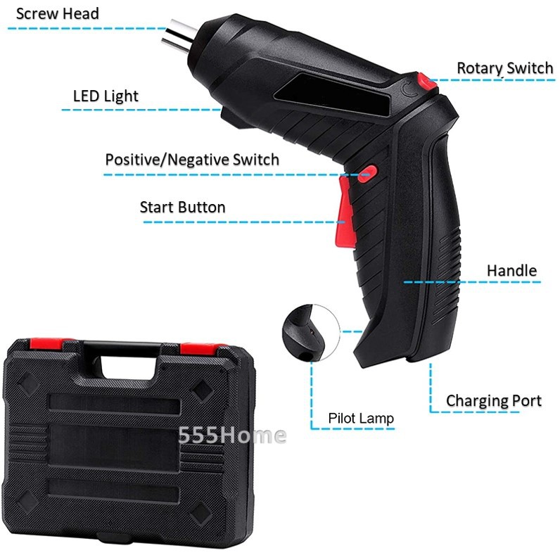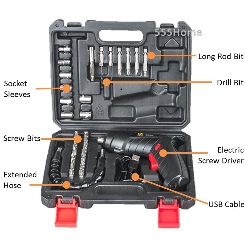 INCLUDES: 1 x Electric Screwdriver; 1 x USB Cable; 1 x Drill Shaft; 1 x 50mm Extension Rod; 1 x 25mm Extension Rod; 8 x Sockets; 2 x Twist Drill Bits; 4 x 50mm Long Drill Bits; 28 x 25mm Drill Bits; and a sturdy carry case to keep everything organized and neatly stored.
