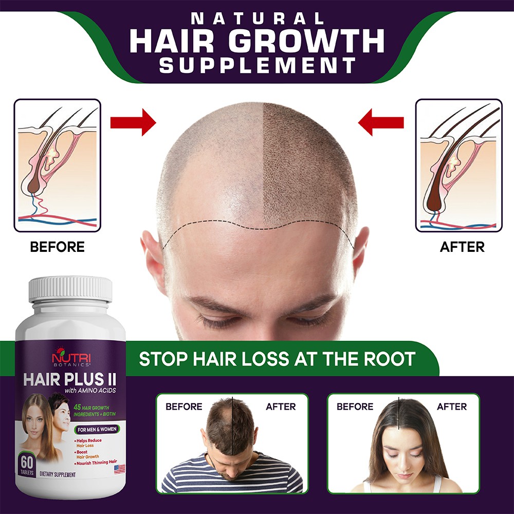 Stop hair loss fast and regrow hair quickly in as little as 30 days with Nutri Botanics Hair Plus II with Amino Acid – the clinically formulated and effective hair growth supplement that works for both men and women.