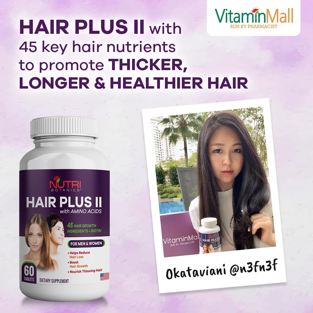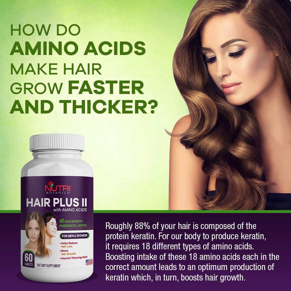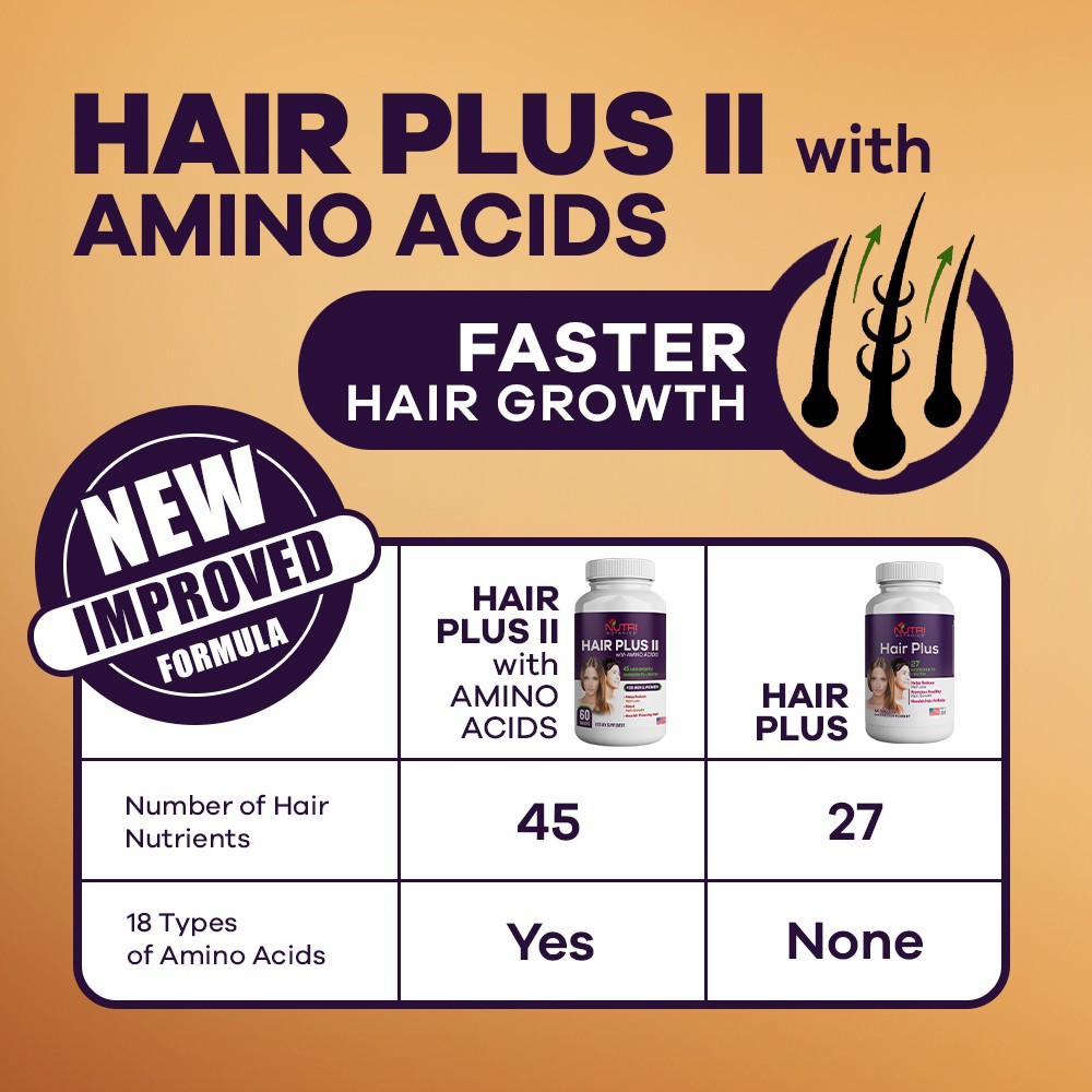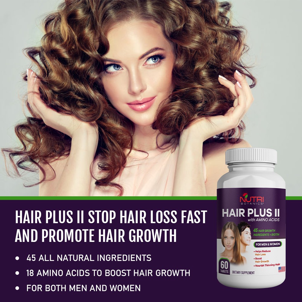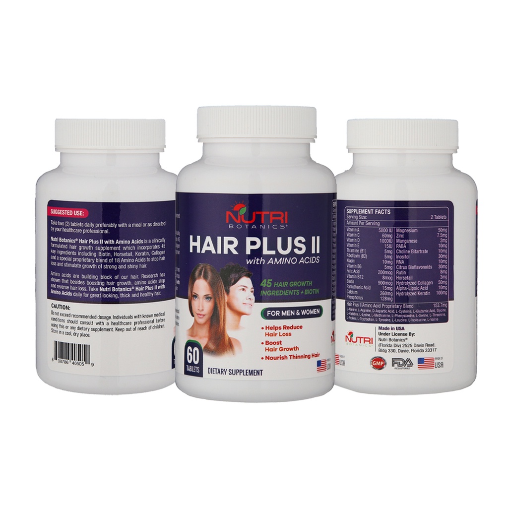 Nutri Botanics Hair Plus II with Amino Acids is clinically formulated to incorporate 45 key hair nutrients including biotin, keratin, B vitamins, collagen, horsetail, and a special proprietary blend of 18 amino acids to help stop hair loss and stimulate growth of stronger and shinier hair.