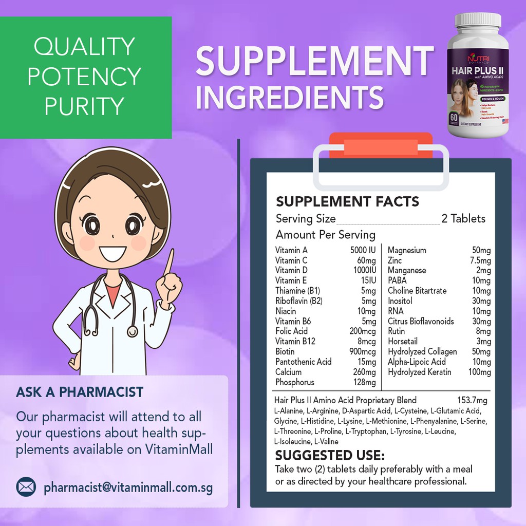 Additionally, Nutri Botanics Hair Plus II with Amino Acids also contains biotin, a co-enzyme and B-vitamin that is essential to support various healthy body function and metabolic processes, and an important ingredient for hair growth. It is an essential nutrient to maintain healthy skin, strengthen hair and nails, support collagen production, aid in bone development, stronger bones, support skin renewal, promote smooth skin and hair regrowth.