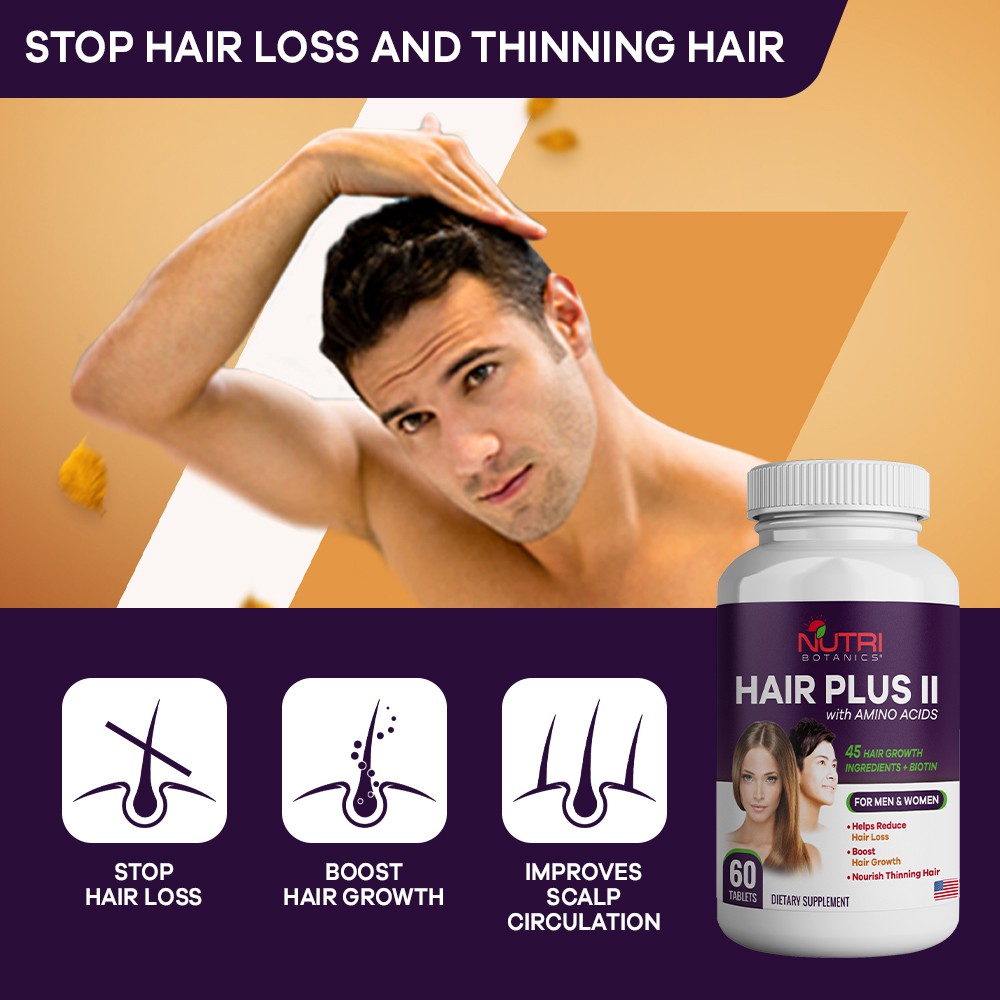 Nutri Botanics Hair Plus II with Amino Acids is the best hair loss supplement for both men and women to stop hair fall and promote hair growth. It contains Amino Acid proprietary blend such as arginine, tyrosine, alanine and cysteine that are essential proteins & hair vitamins for hair follicles, preventing balding. As we age, the rate of hair loss increases while hair growth decreases. It is important to maintain healthy hair follicles to reduce hair fall and maintain thick and shiny hair.