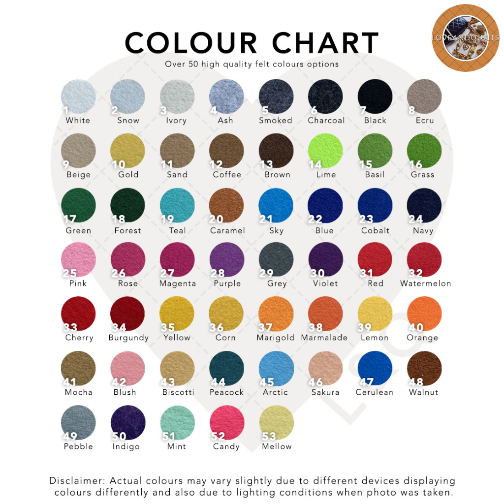 ⋆ Over 50 high quality felt colours options available (Please refer to colour chart)