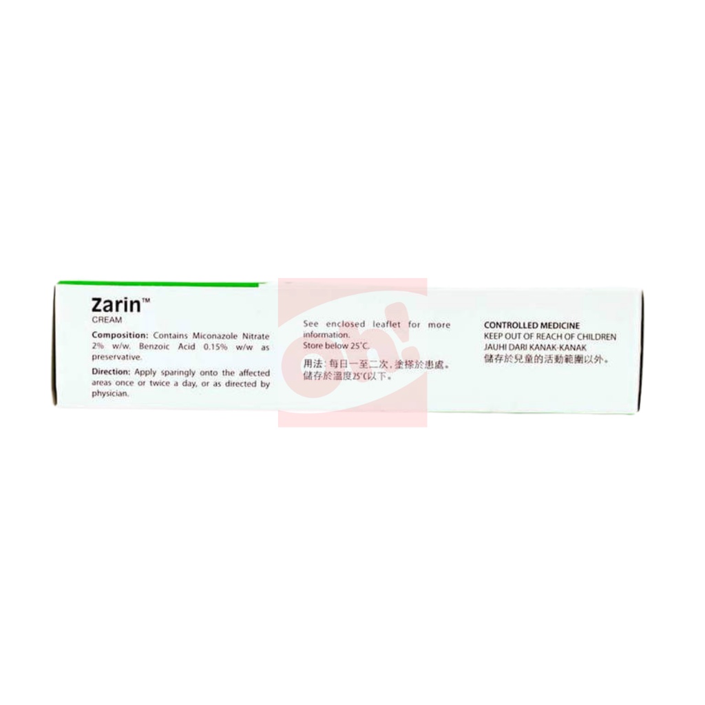 Zarin Cream is an antifungal cream used for treating athlete's foot, tinea, ringworm and thrush infections of the skin caused by fungi, including yeast.