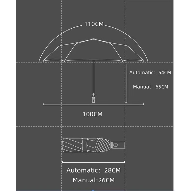 ★【SUPERIOR WINDPROOF AND WATERPROOF】Our windproof umbrella is flexible enough to withstand powerful wind without turning inside out. It is fortified with 8 reinforced fiberglass ribs. The canopy is made of high density 210T waterproof material which makes it good at waterproof function. Besides it is 110cm arc, you don't have to choose between gigantic windproof umbrellas or tiny ones that cannot provide minimal wind protection.