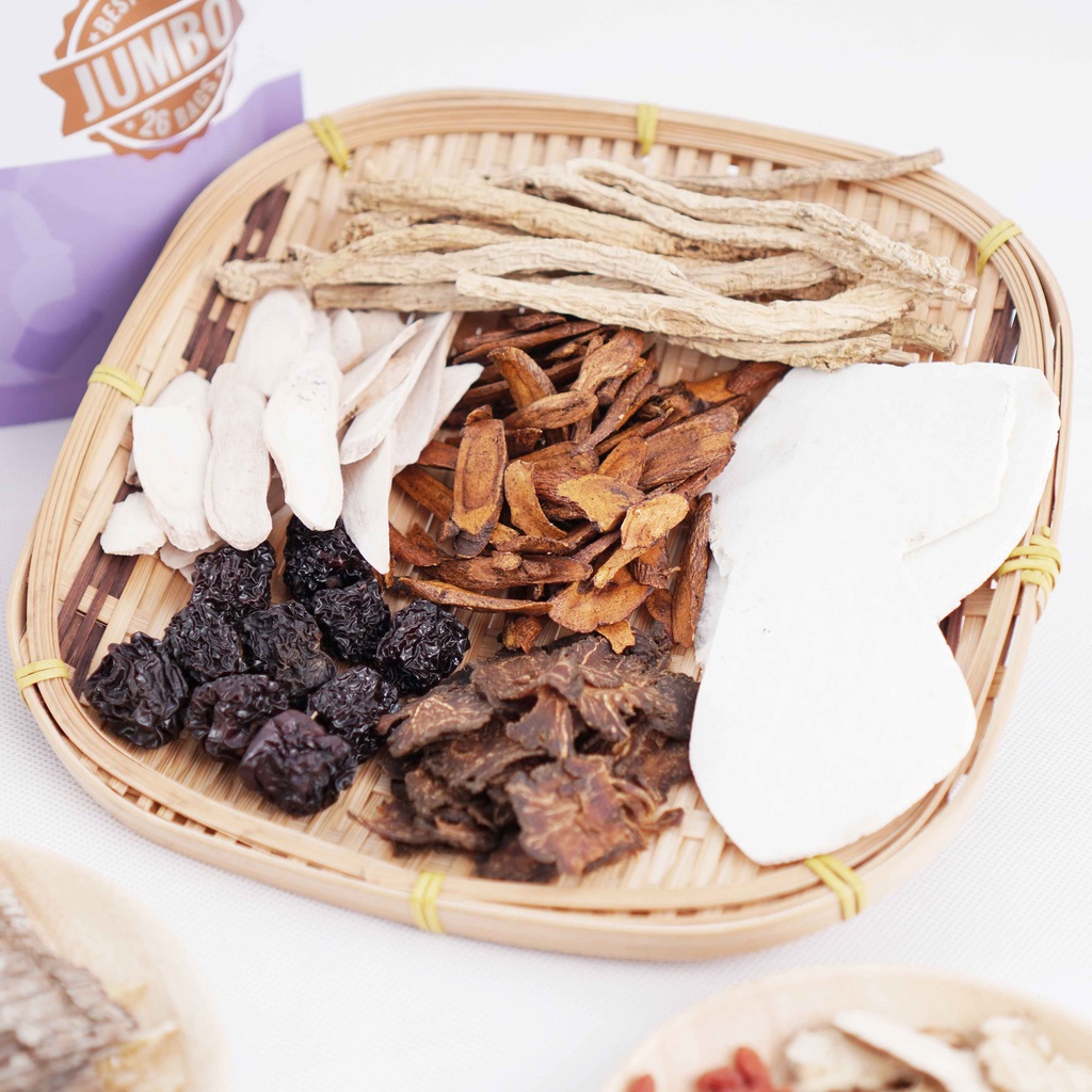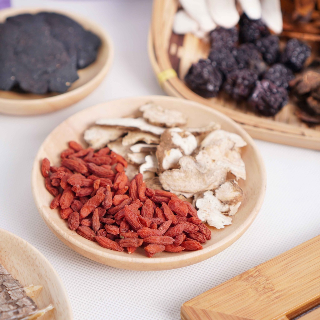 Black Date, Prepared Rehmannia, White Peony, Prepared Licorice, Codonopsis, Vege Seasoning, Goji, Eucommia Bark, Poria Cocos, Angelica, White Atractylodes Rhizomes, and Ligusticum Wallichii.