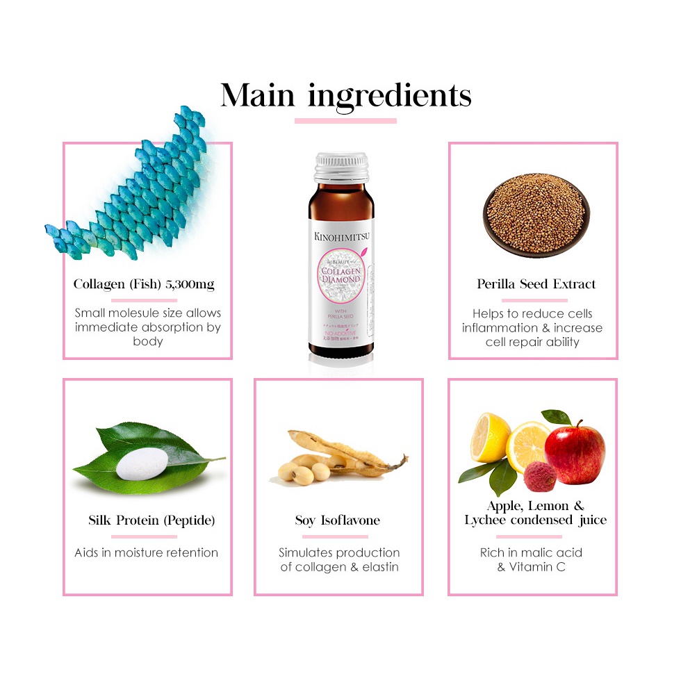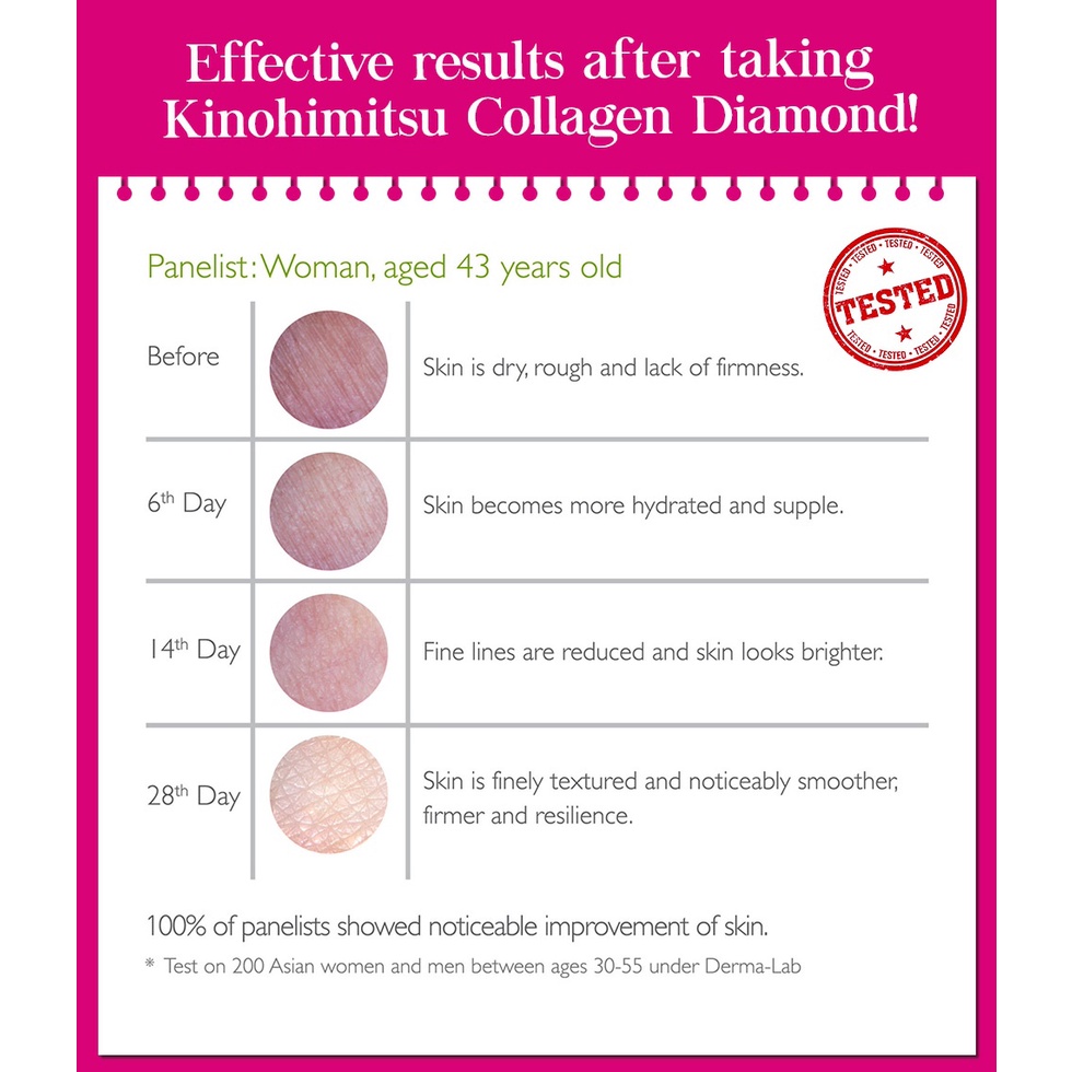 By actively boosting collagen synthesis and repairing damaged collagen fibres, Kinohimitsu Collagen Diamond 5300 Drink reduces signs of ageing such as fine lines, wrinkles and dryness.