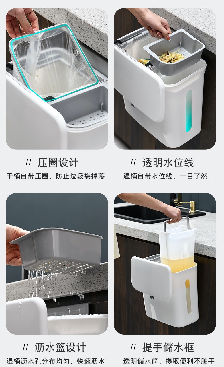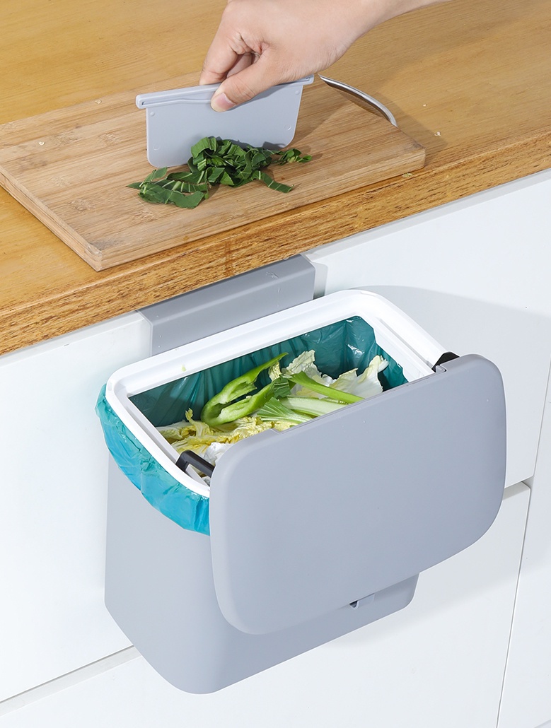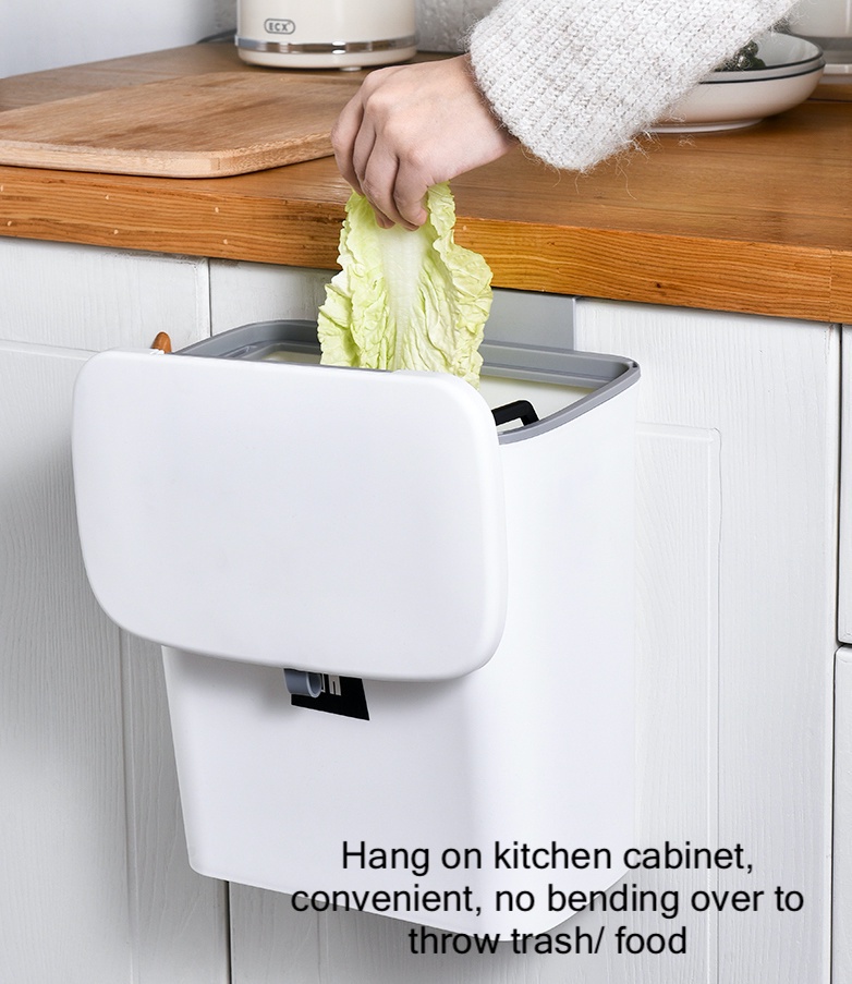Hang on kitchen cabinet, convenient, no bending over to throw trash/ food