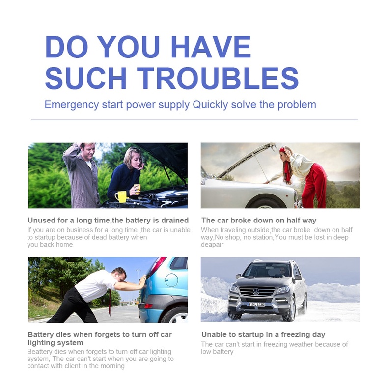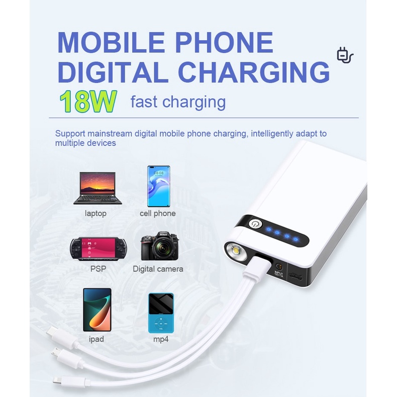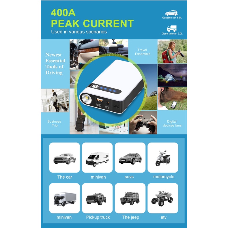 ⭐ 30000mah large capacity for 12V vehicles jump start. Support to use about 30 times for max 4.0L 12V vehicle.