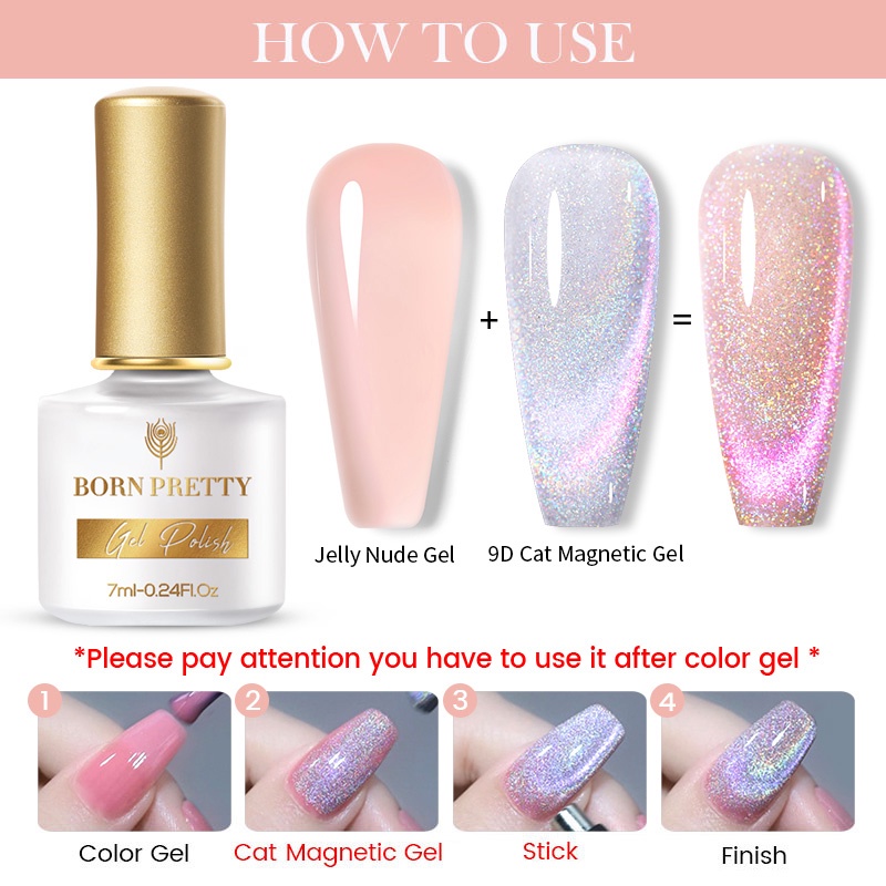 Tips: It is recommended that you can apply jelly nude gel or black gel before applying the 9D Cat Magnetic Gel for better effect.