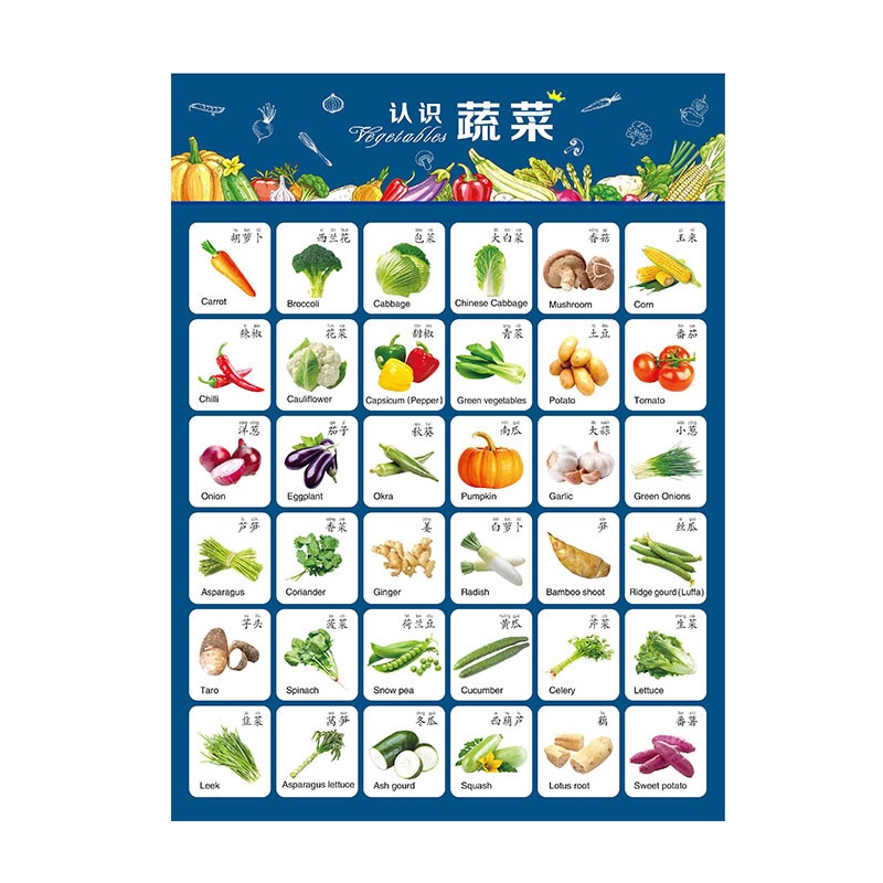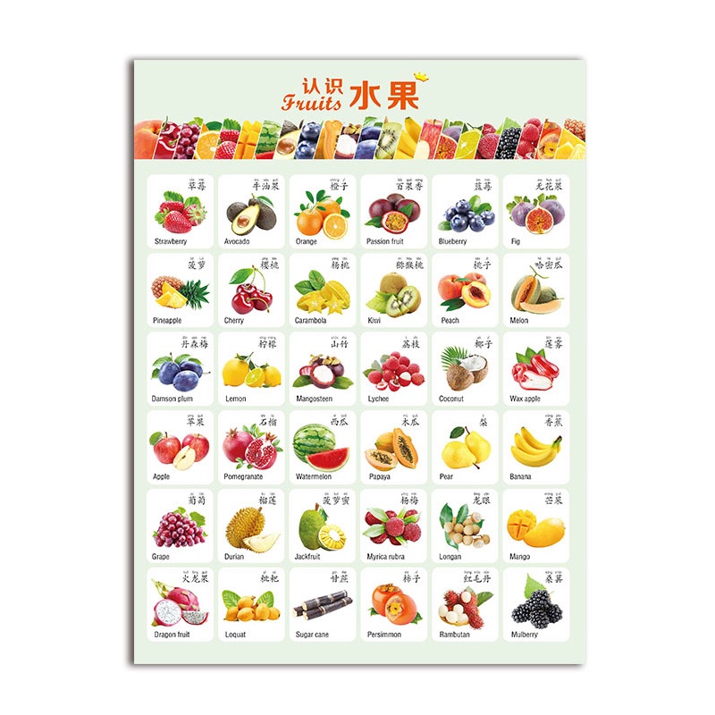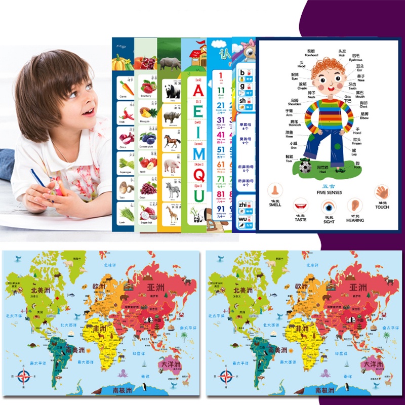 8 DIFFERENT STYLE POSTER: fruits, vegetables, animals, numbers, letters, human body parts, world map, pinyin.