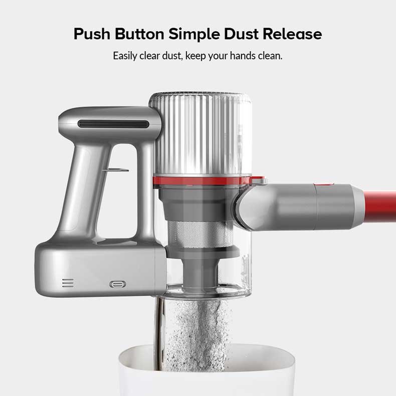 - New dust cup design, smooth gliding to lock or unlock, press one button to release all dust into bin
