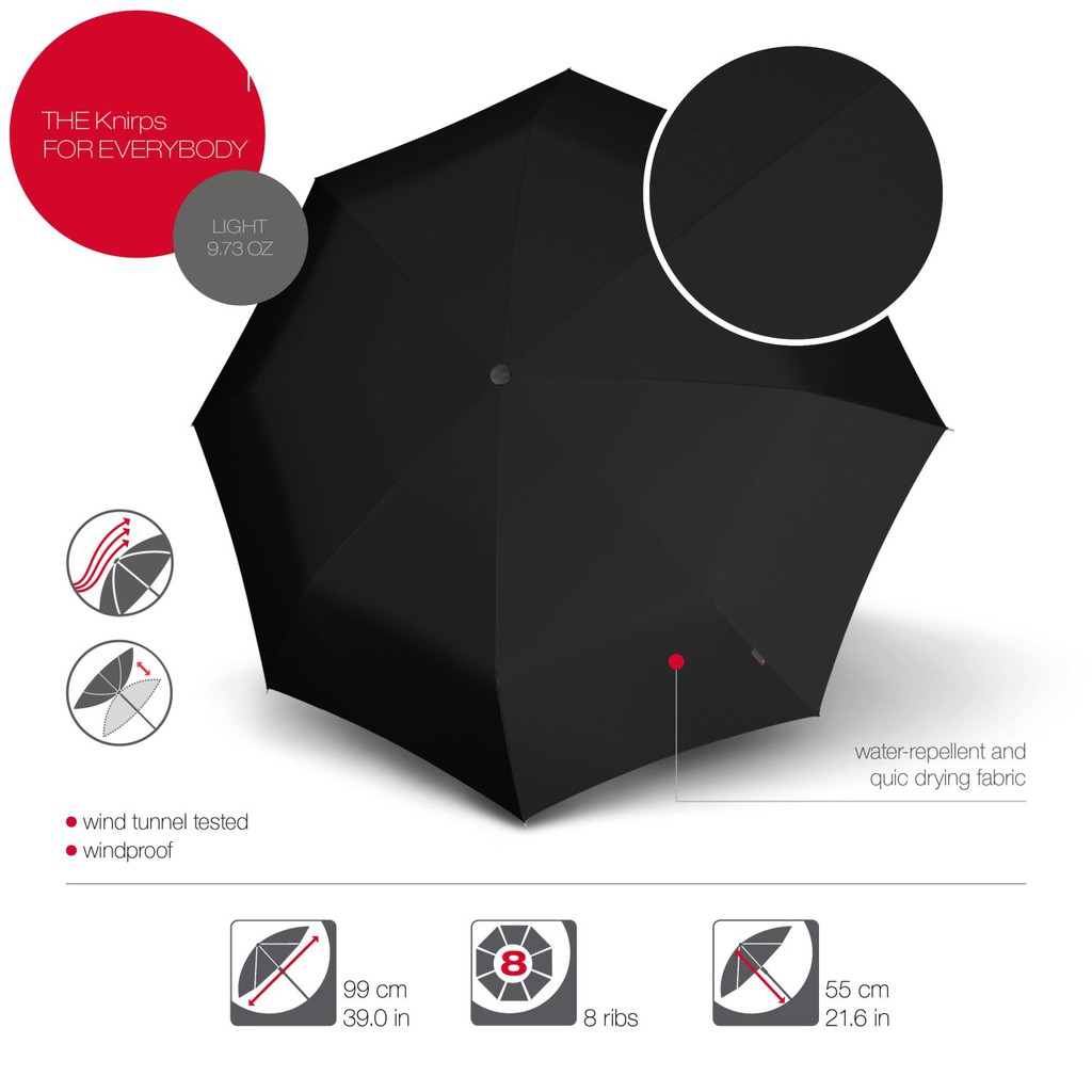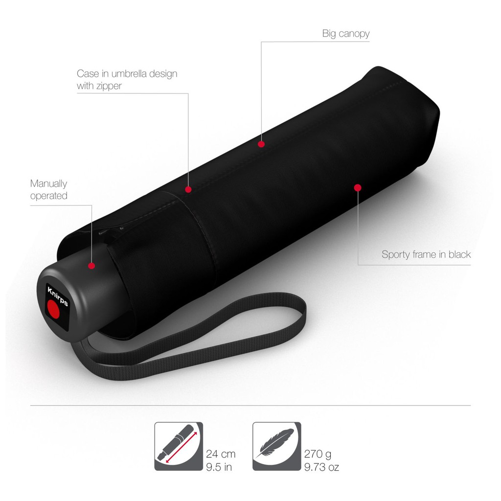 Due to the 3-piece steel pole, this model can be folded to a comfortable 24 cm and therefore easily fits in a bag or backpack. The umbrella is manufactured in well-known Knirps quality and has been tested in a wind tunnel at wind speeds of up to 80 km/h. The stability is additionally increased by the 8 struts in the canopy, as the struts distribute the wind load optimally. The frame is kept in modern black and the canopy is available in different colours.