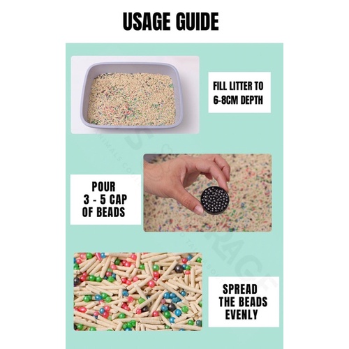 • Deodorising beads are suitable for all types of cat litter (Tofu Cat Litter, Silica Gel, Wood, Bentonite Clay)