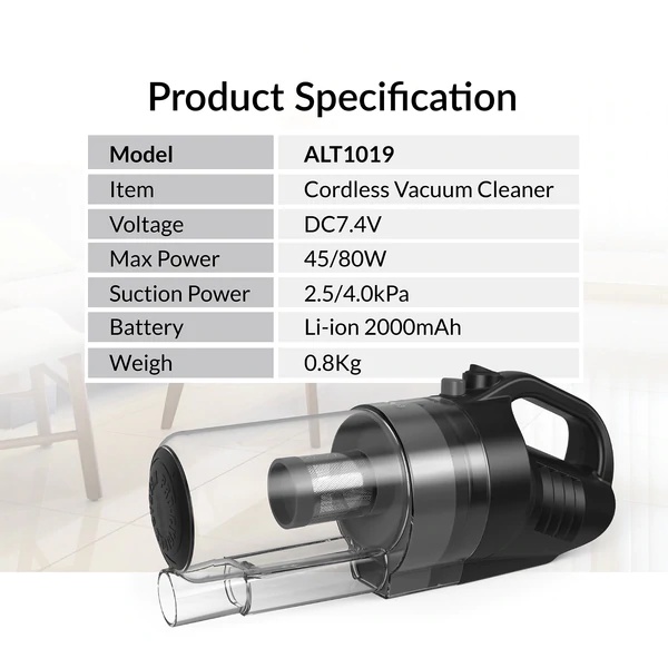 ALT1019 comes with a classic floor brush, two extension pipes, a vacuum cleaner, and a charging cable. Dual-Power 30min on Silent mode and 15min on Power mode