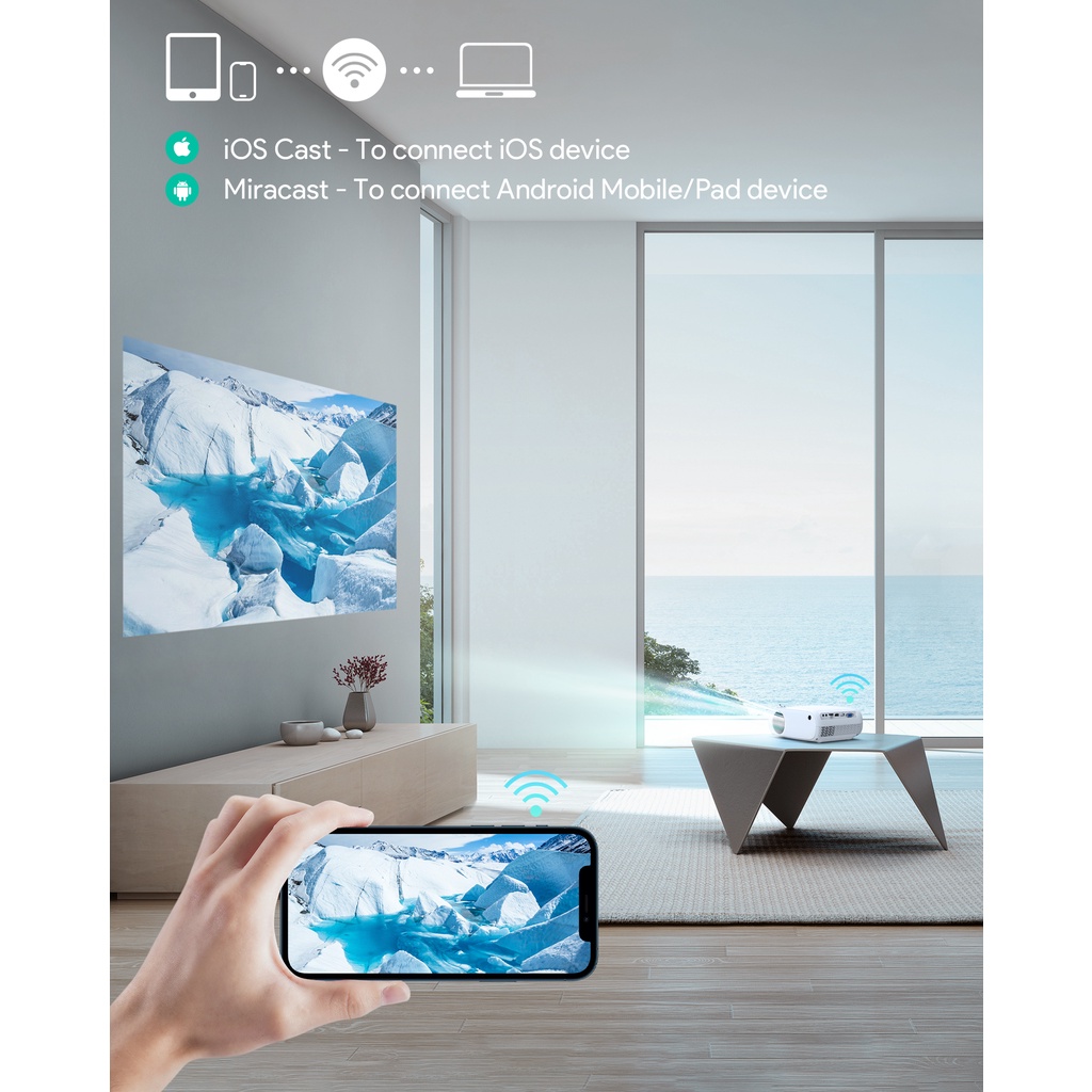 Simple & Reliable Wireless Connection: Stream video & audio from your iOS or Android device to the projector using iOS Aircast, Miracast for Android, or similar Wi-Fi direct broadcast services. Fully enjoy movies, photos, and games from your mobile device with a bigger & better picture