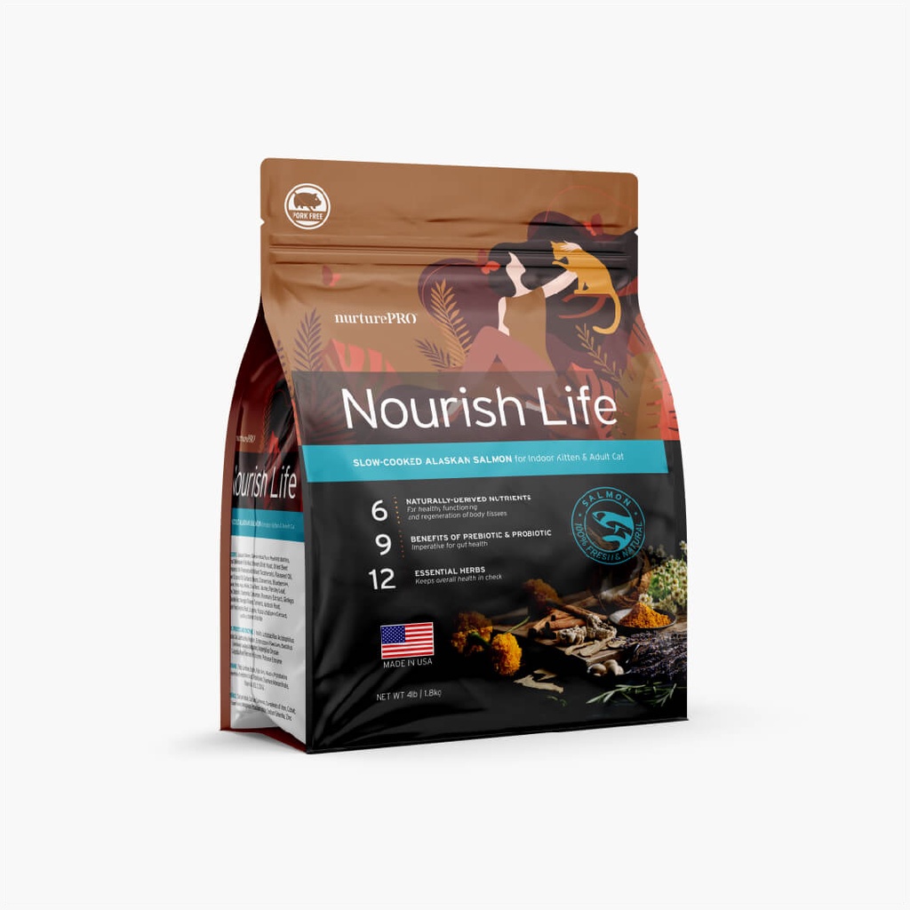 Nurture Pro Nourish Life Alaskan Formula is primarily for kittens and adult cats, who groom and primarily live indoors.