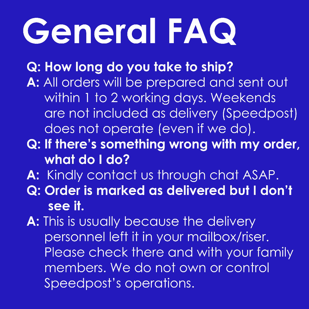 Take note that Speedpost usually delivers your order to your mailbox. Check there if you do not receive your order at your doorstep. Do check your mailbox if you fail to receive your order.