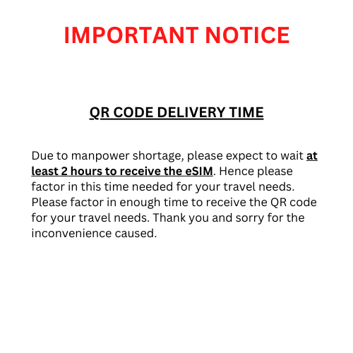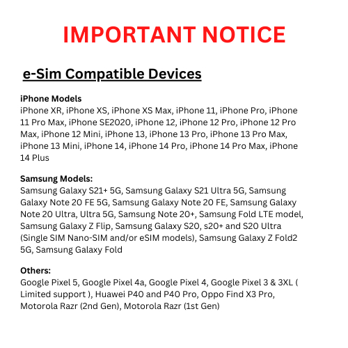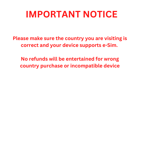 Please ensure that the country you are visiting is included in the list and your device is compatible with e-Sim. No refunds will be entertained for errors caused on your end or for change of mind as we cannot take back e-Sim once we issue you the QR Code.