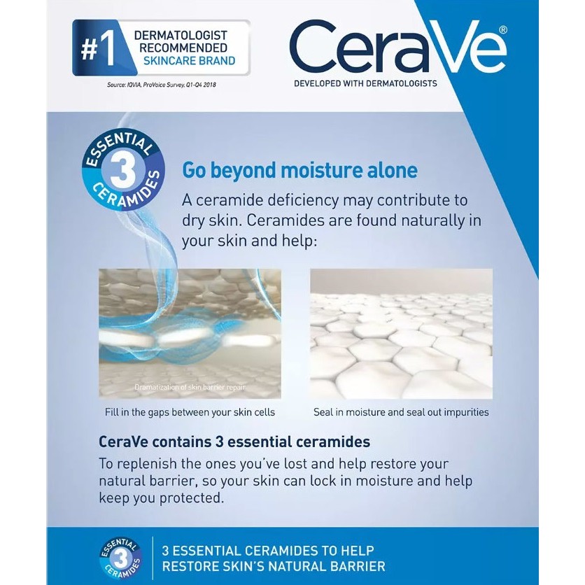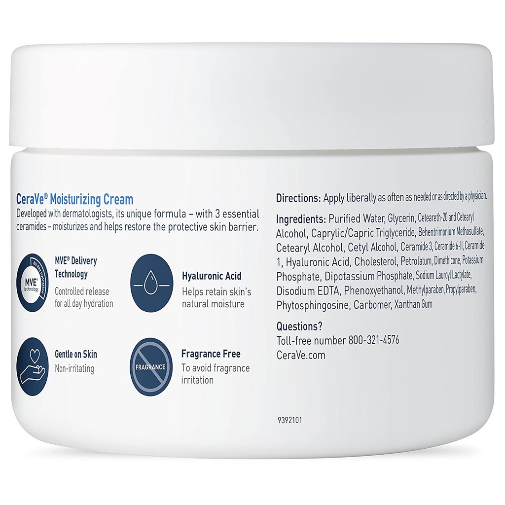 CeraVe Moisturizing Cream is a barrier-reinforcing moisturizing cream for skin conditions like eczema and psoriasis. It hydrates as it helps restore the skin’s protective barrier. Developed with dermatologists and ideal for dry and very dry skin on the face and body, this rich, non-greasy, fast-absorbing moisturizing cream features patented MVE Delivery Technology to release a steady stream of hyaluronic acid and three essential ceramides throughout the day and night. Suitable for sensitive skin, this cream also helps the skin hold on to moisture while improving its look and feel.