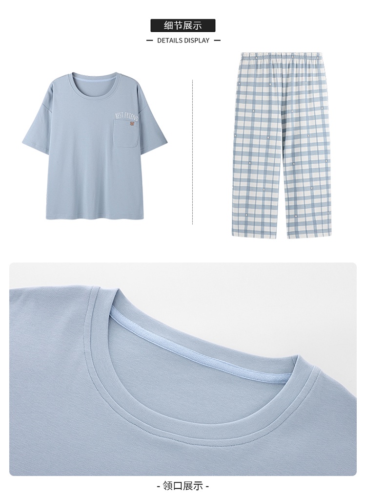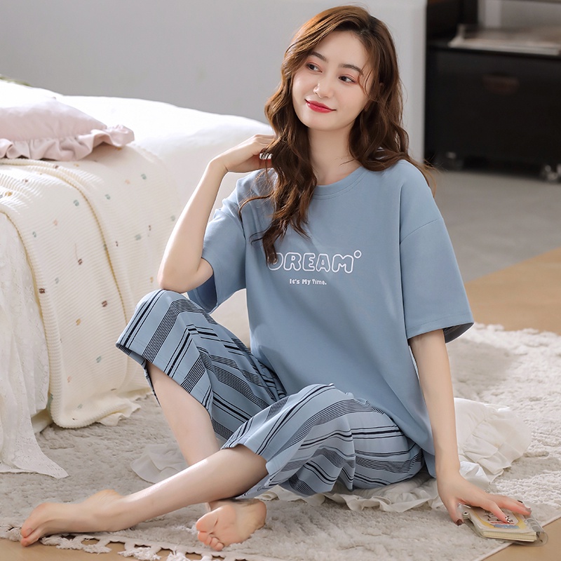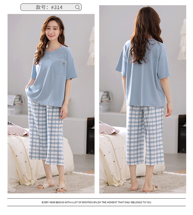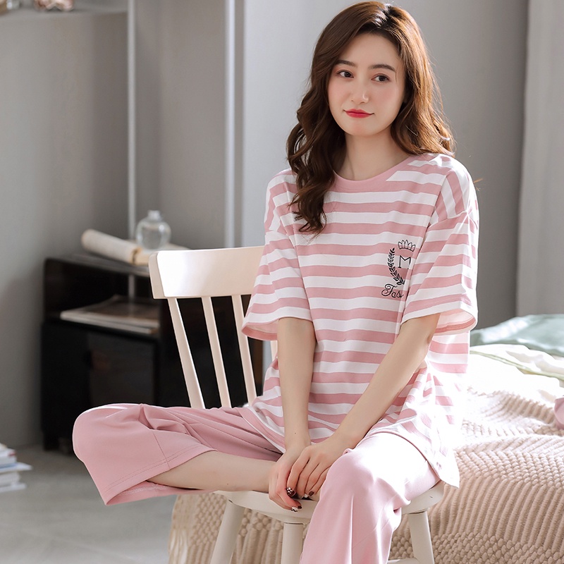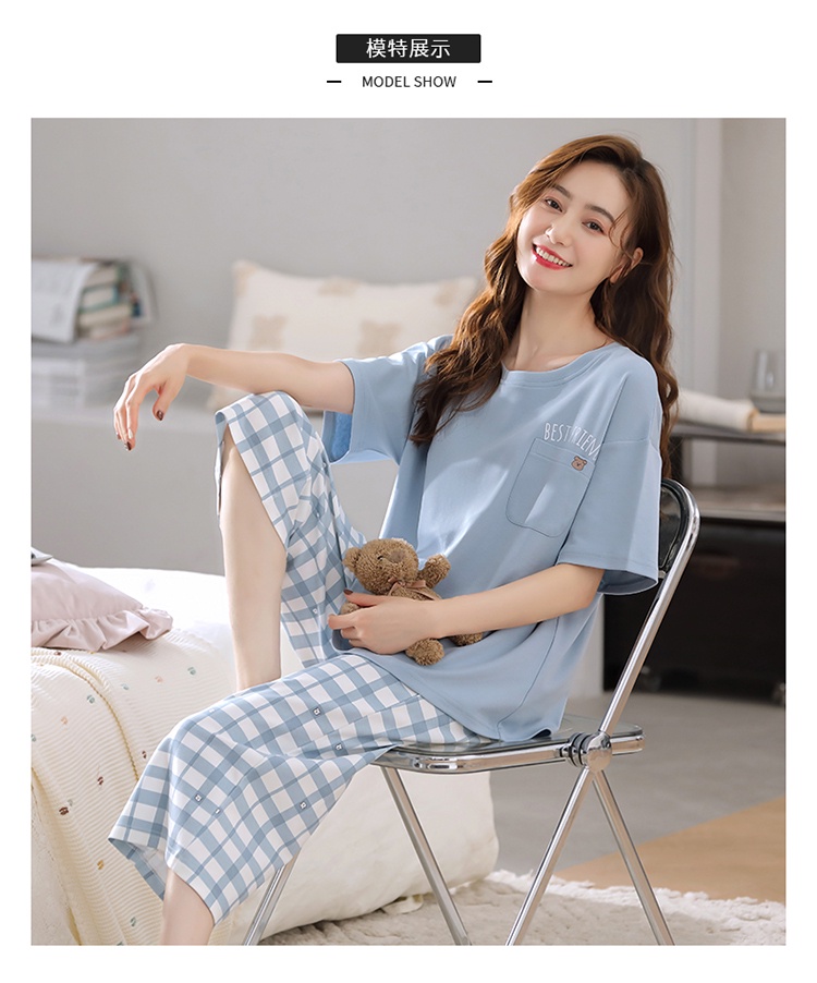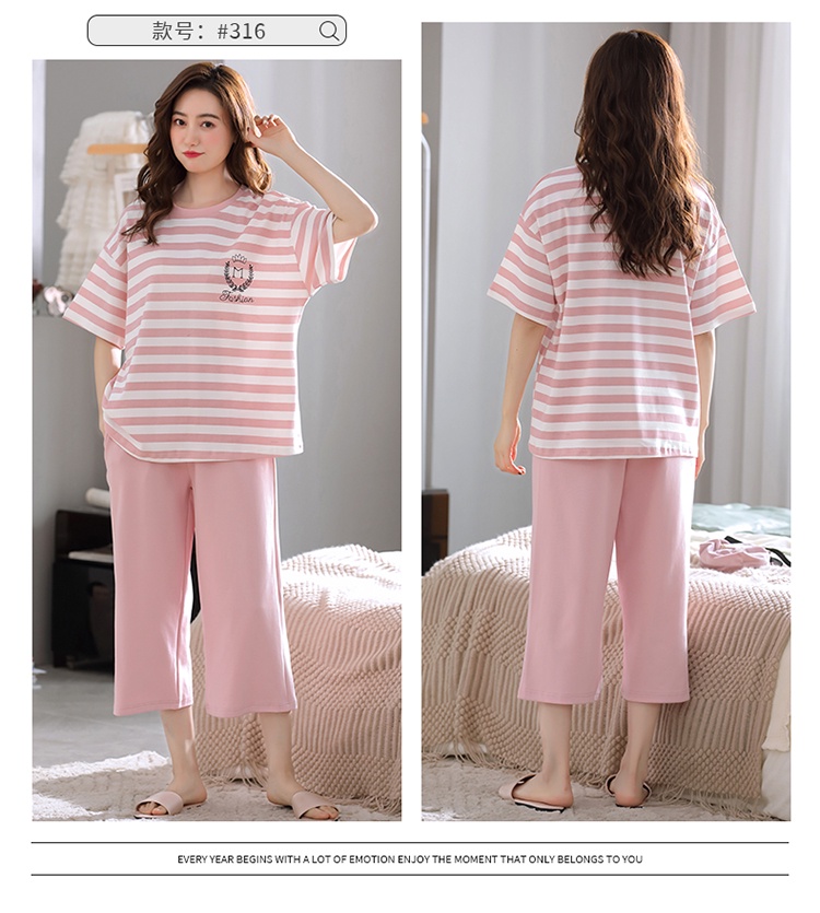 Plus Size Sleepwear 3/4 Length Pyjamas Women M-3XL Cotton Short Sleeve Pajamas Set Popular Plaid Stripe Printing Homewear