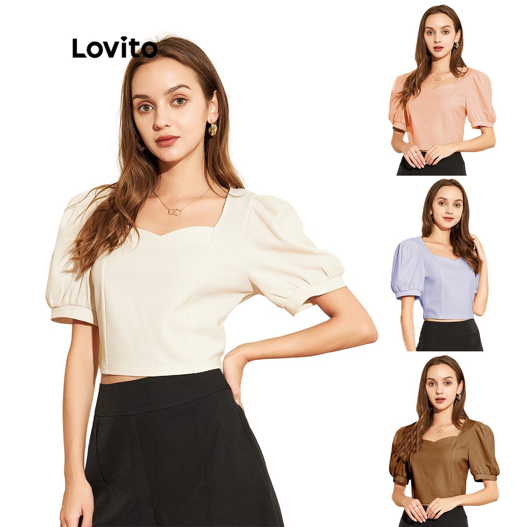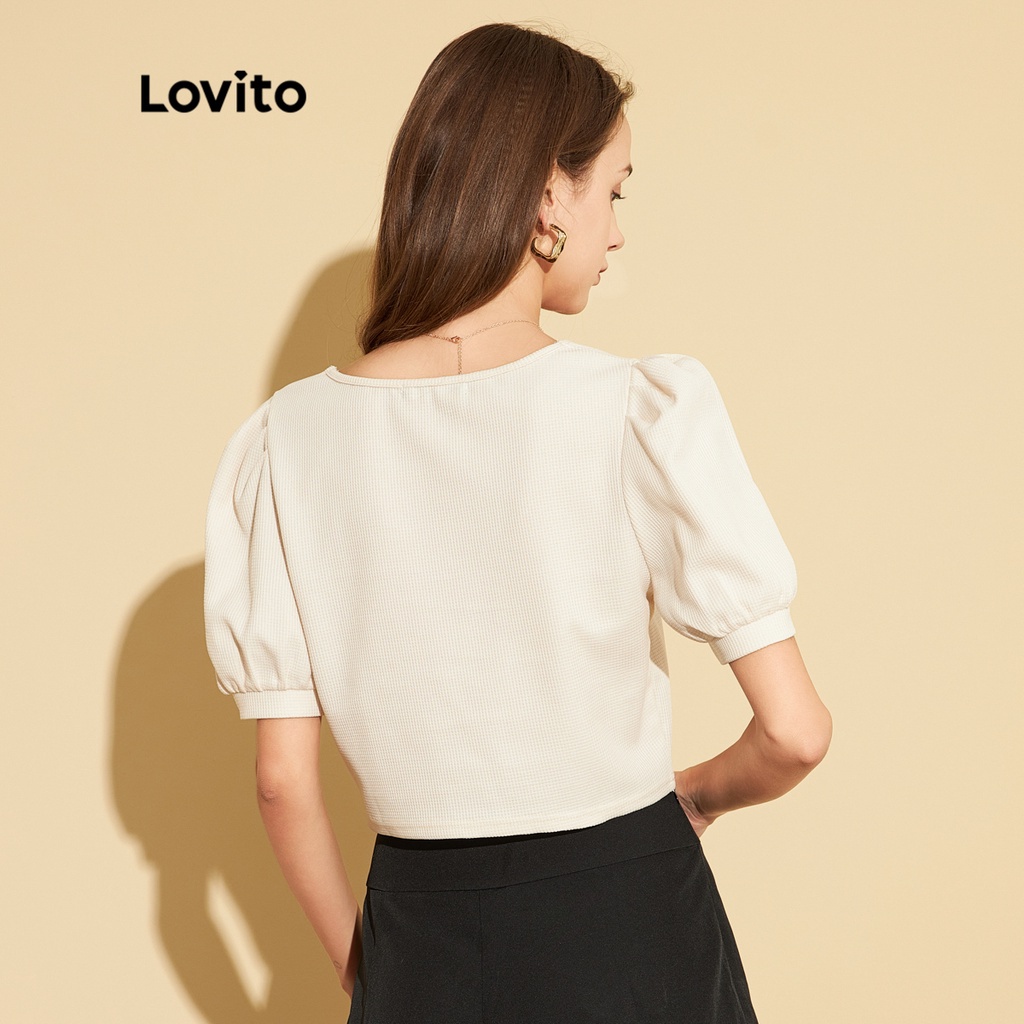 ?this plain t-shirt uses textured fabric and with square neck and puff sleeve design