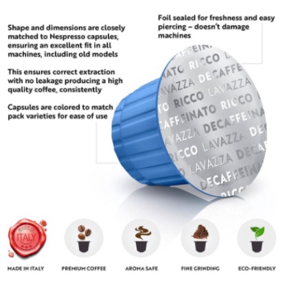 Lavazza Decaffeinato Ricco Espresso Capsules (A velvety coffee, with a sweet and rich taste.)