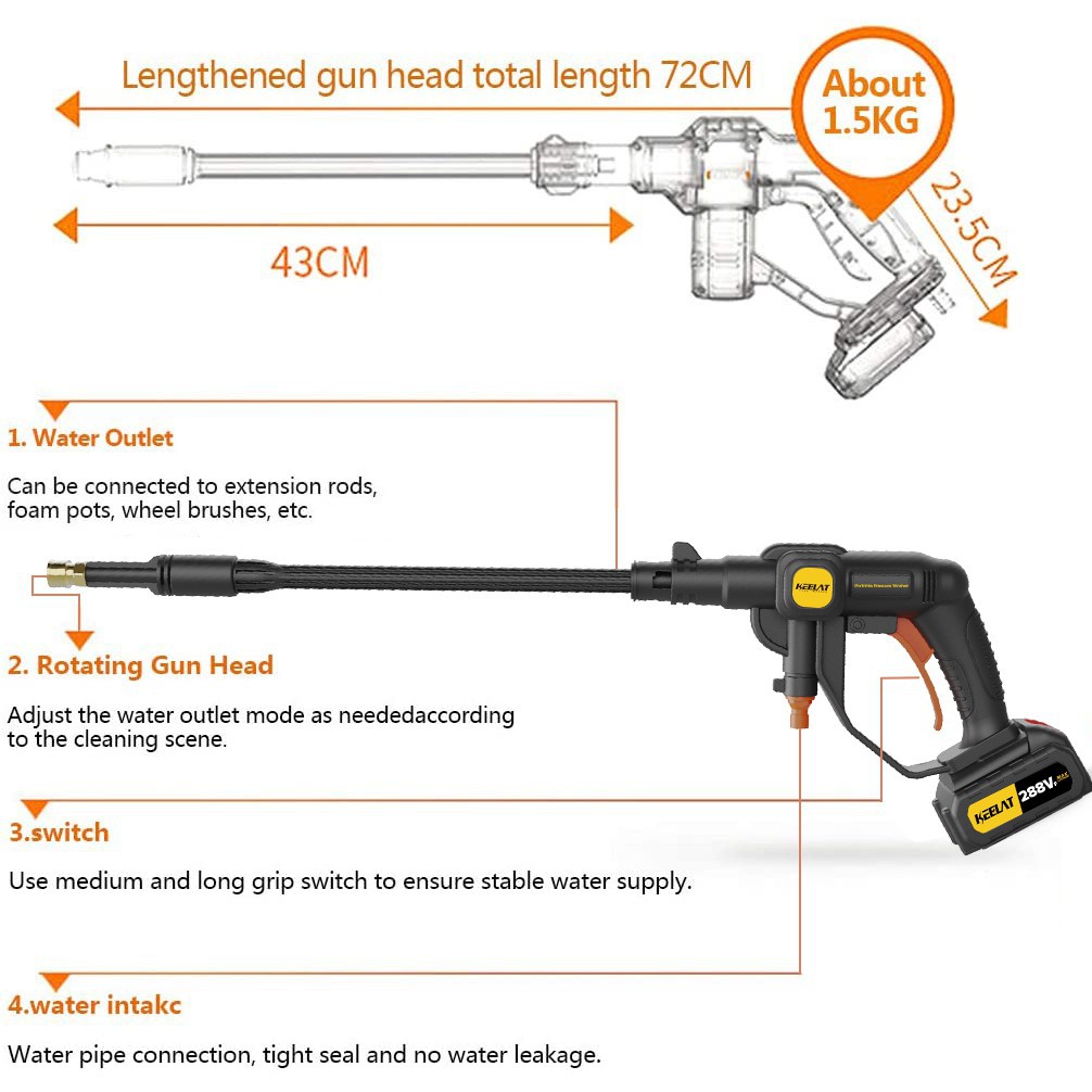 【Cordless & Easy to Use】: No wires limited,you can clean wherever you want,288Vf and 15000mah ultra-capacity battery, long battery life and can provide 36Bar water pressure,5 meters long water pipe.