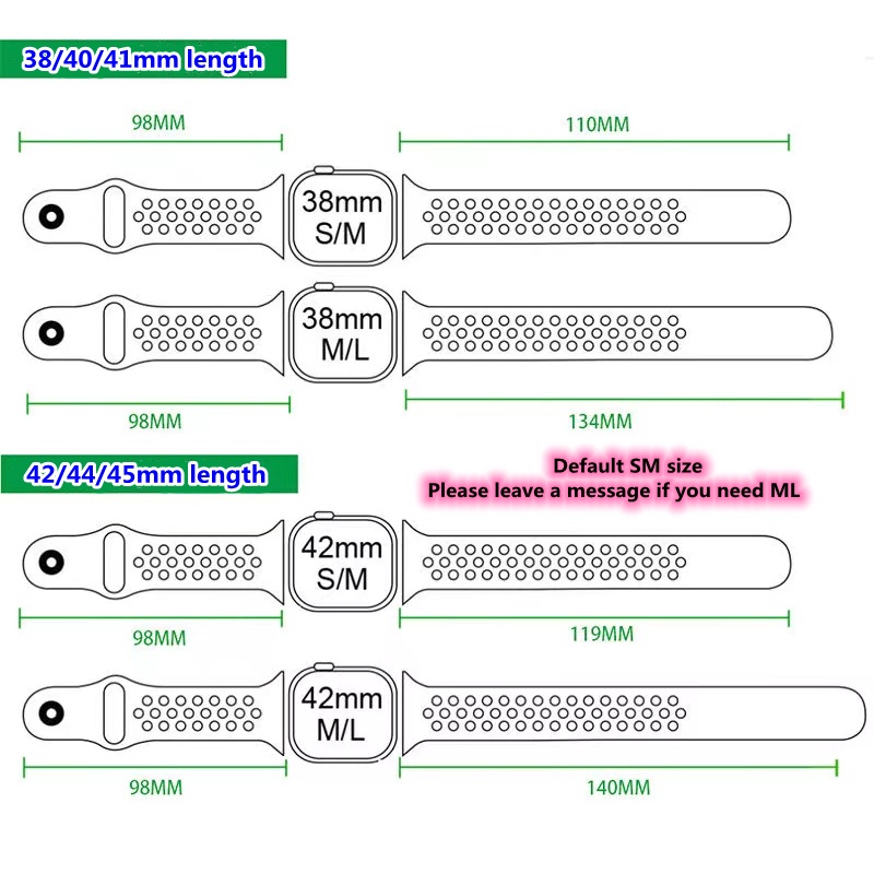 (size)41mm 40 mm 38 mm S/M - (for wrist:) 5.1"-7.1" (130 mm-180 mm)