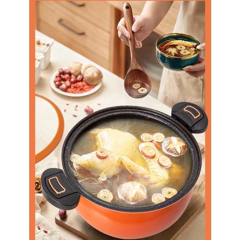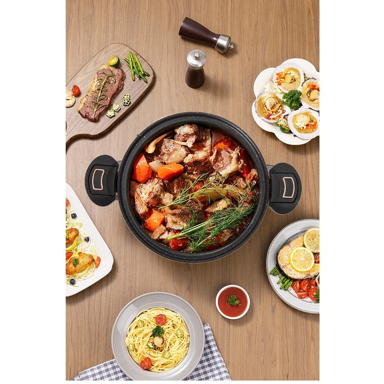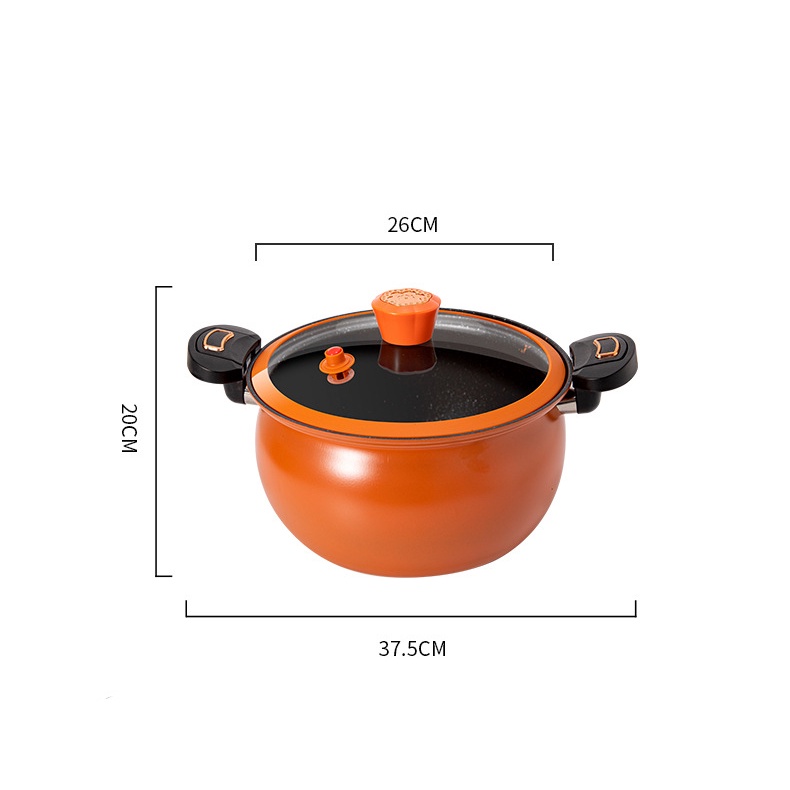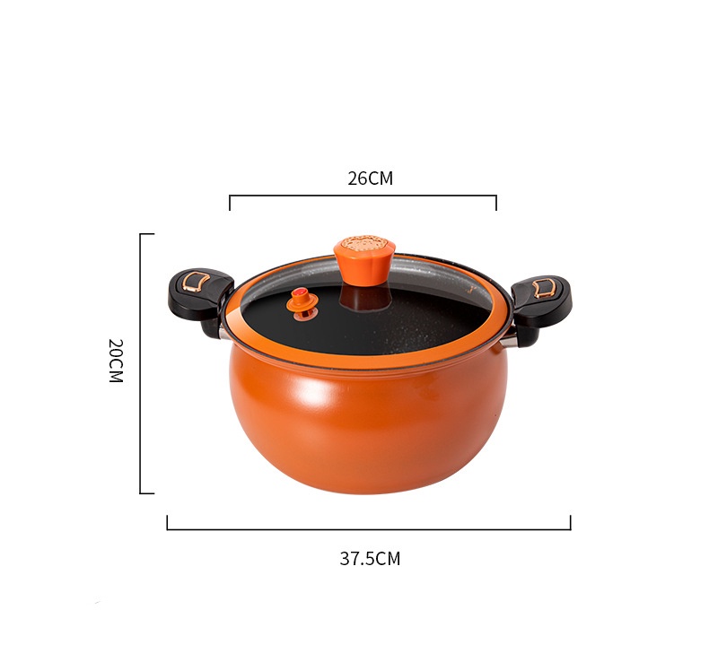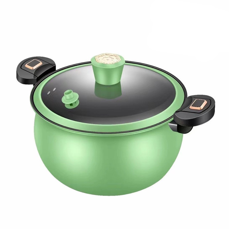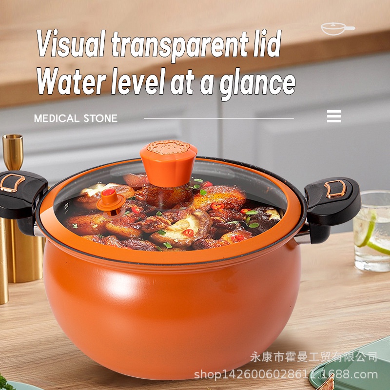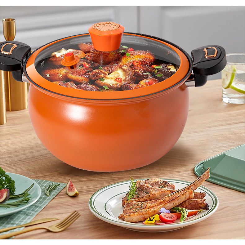 pressure cooking pot. The pot is made from thick iron layer. It has a pressure lid that can be secured seal locking the lid with the pot's handle. Pressure cooking helps preserve food nutrients and ensure a more rich taste and deliciousness of the food due to proper high pressure cooking. The lid cover has a pressure safety valve to vent out pressure from the pot while cooking. It is suitable for a wide range of cooking methods which is gas stove and induction cooker. The inner pot is nonstick.