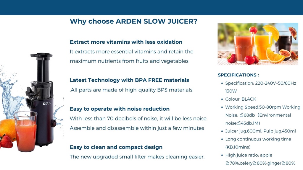 [Fast Delivery] [Local warranty] Arden Cold Press Slow Juicer Easy to Clean, Pulp Measuring Cup, Less Oxidation