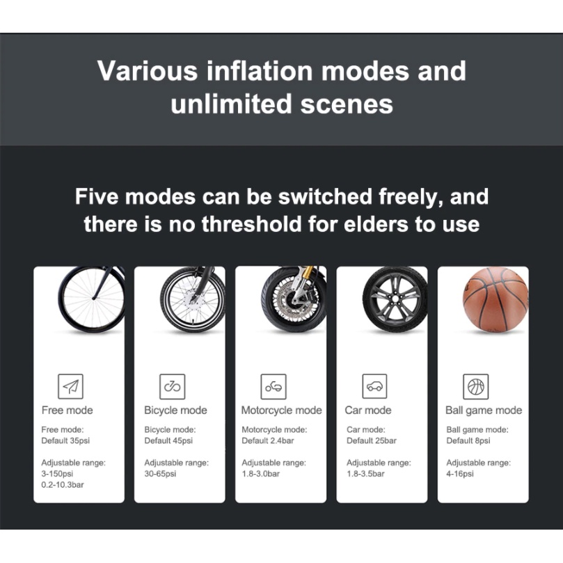 * Five inflation modes. Bicycle/car/motorbike/ball/free modes