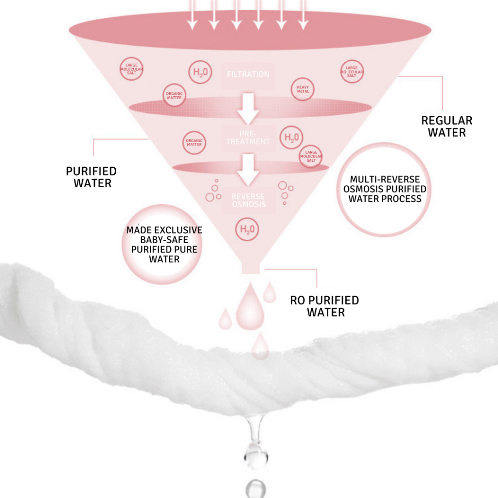 CE, FDA, SGS, ISO9001, ISO14001 Certified | 100% Pure Cotton, Non-Woven Fabric \ Bacteriostatic Rate 99.9% | RO Pure Water  | 6x Layer of Filtered Pure Water (Quartz Sand Filter, Activated Carbon Filtration, Fine Filtering, First Level Reverse Osmosis, Second Level Reverse Osmosis, RO Deionized Water) | Natural Formula | Fragrance & Alcohol Free