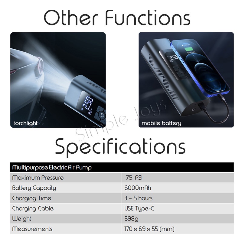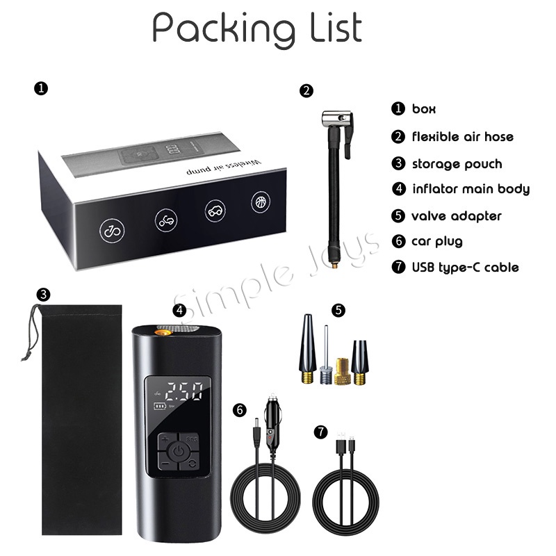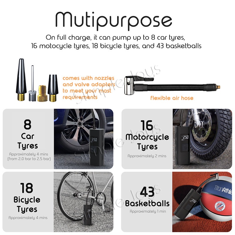 Multifunction Tyre Pump - Comes with multiple nozzle adapters to meet your different requirements. Suitable for cars, motorcycles, bicycle tyres, swimming rings, balls, and other inflatable products.