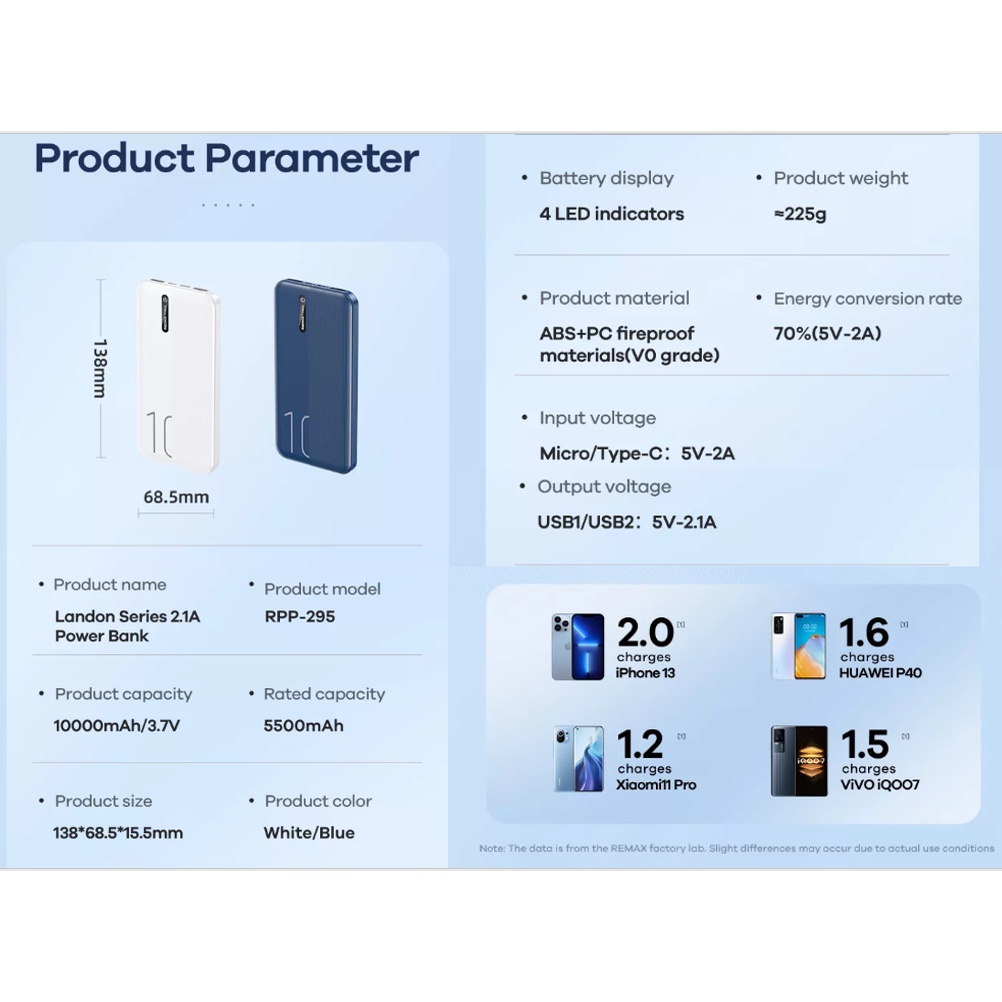 Remax 10,000mAh Light weight Power Bank RPP295 (Blue, White)