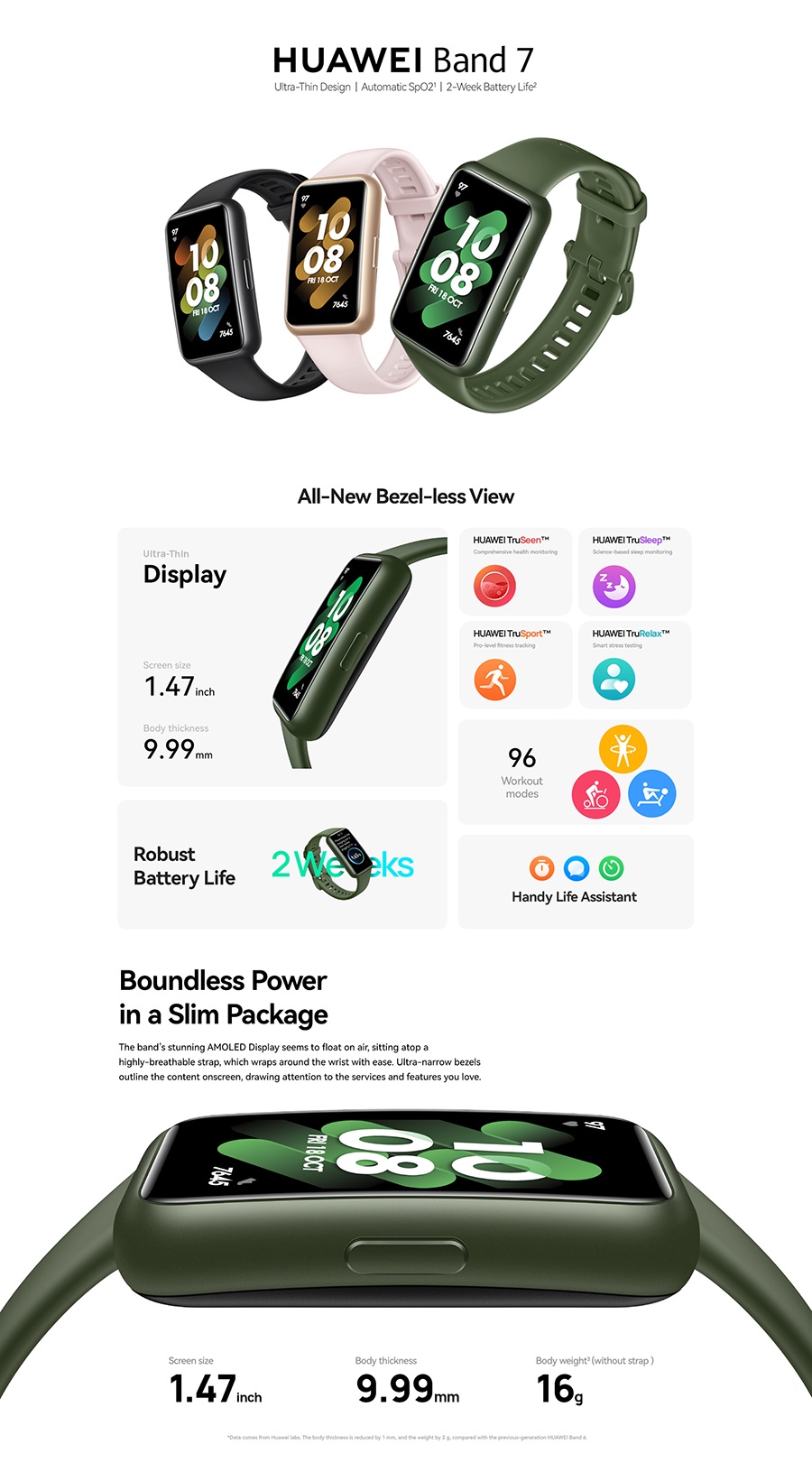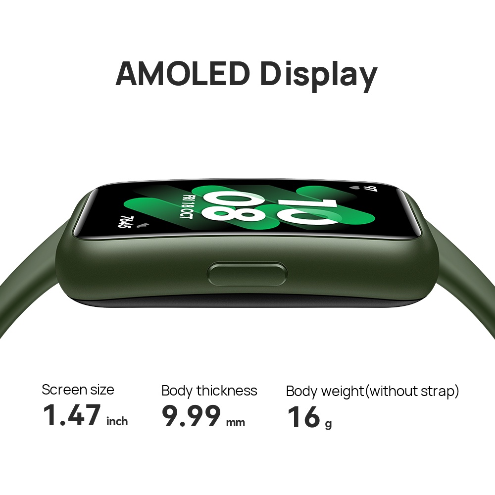 • 【Slim bezel-less screen】: HUAWEI Band 7 is super light weight about 16g* with a 1.47" screen size which wraps around the wrist with ease. Ultra-narrow bezels outline the content onscreen, drawing attention to the services and features you love. The band's stunning AMOLED FullView Display seems to float on air, sitting atop a highly-breathable strap.