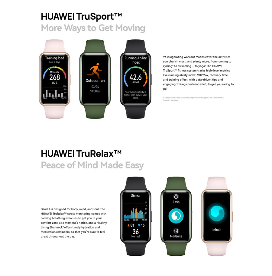 • 【96 workout modes】: 96 invigorating workout modes cover the activities you cherish most, and plenty more, from running to cycling to swimming… to yoga! The HUAWEI TruSport fitness system tracks high-level metrics like running ability index, V02 max, recovery time, and training effect, with data-driven tips and engaging TriRing check-in tasks*****, to get you raring to go!