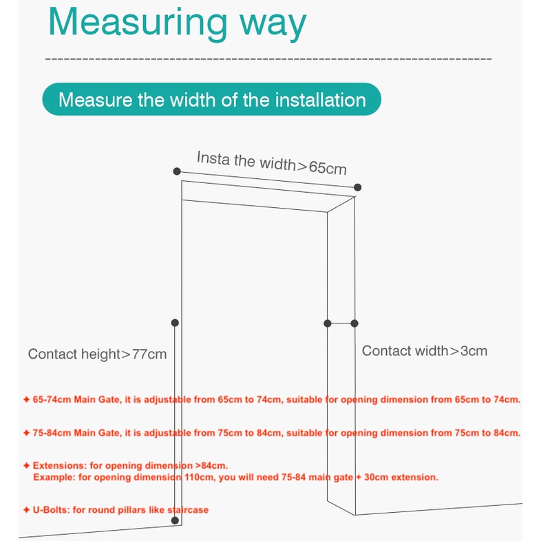 ⚫️ 65-74cm Main Gate, it is adjustable from 65cm to 74cm, suitable for opening dimension from 65cm to 74cm.
