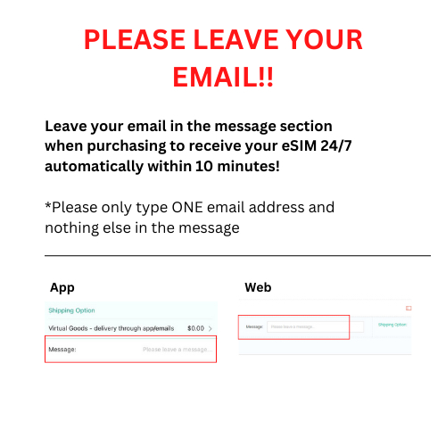 !! IMPORTANT NOTICE !!When purchasing, include ONE EMAIL ADDRESS in the message section to receive your eSIM via email (please check spam folder) 24/7 within 10 MINUTES of ordering!