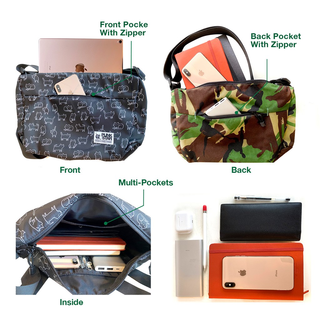 PUNKSTAR light weight multi-pockets sling bag is versatile and multi functional. With the Adjustable strap it offers a big space to hold your iPad, cell phone, notebook, purse, wallet, keys, passport, water bottle, sunglasses etc. Explore its wide range of use for school, work, cycling, fishing, hiking, traveling, camping, beach and outdoor activities. Great for women, men and kids.