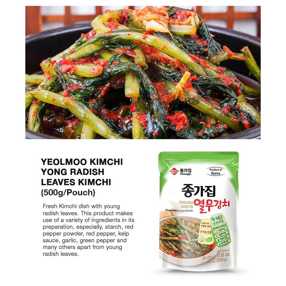This fresh kimchi is made with young radish leaves. The product uses a variety of ingredients in its preparation, especially starch, red pepper powder, red pepper, kelp sauce, garlic, green pepper and many others.