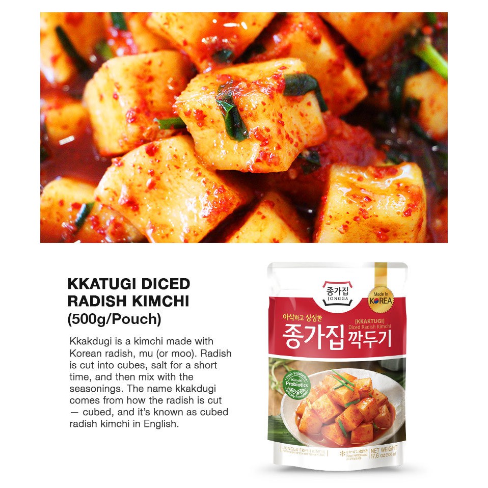 Kkakdugi is a kimchi made with Korean radish, mu (or moo). Radish is cut into cubes, salted for a short time and then mixed with seasonings. The name kkakdugi comes from how the radish is cut -- cubed, so it is known as cubed radish kimchi in English.