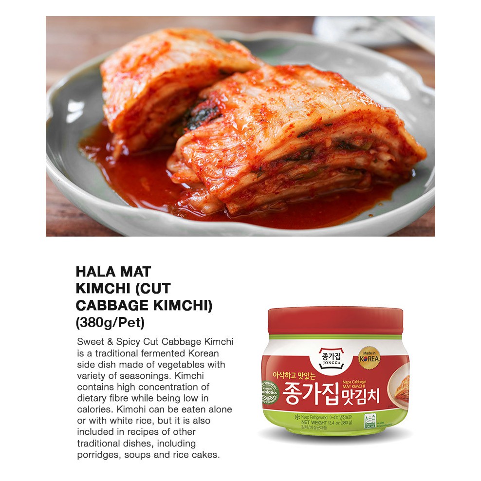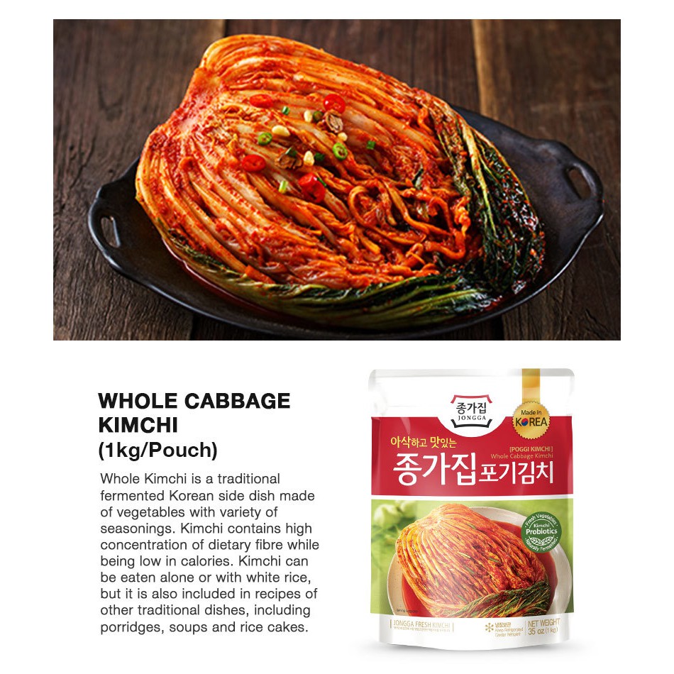 Whole Cabbage Kimchi is a traditional fermented Korean side dish made of vegetables with variety of seasonings. Kimchi contains high concentration of dietary fibre while being low in calories. It can be eaten alone or with rice but it can also be included in recipes of other traditional dishes, including porridges, soups and rice cakes.