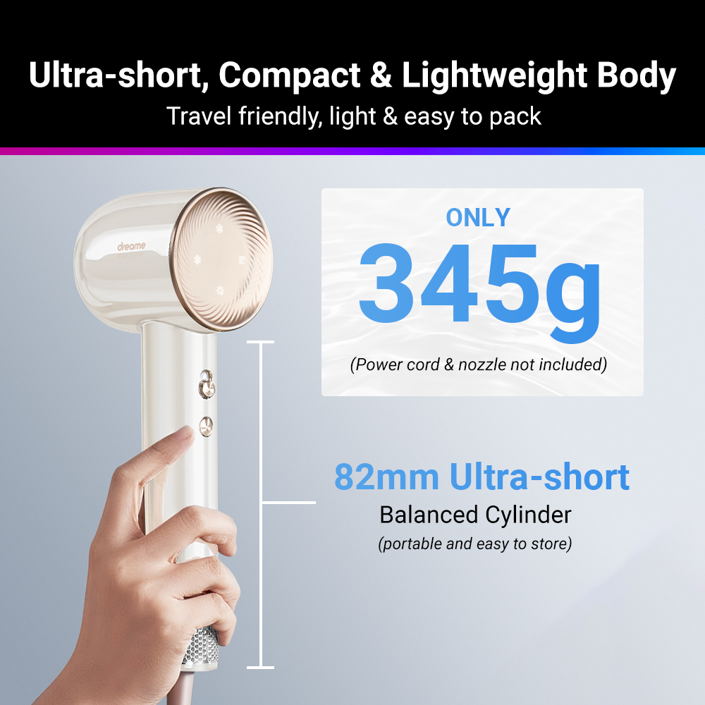 A lightweight 345g build with a compact 82mm main cylinder makes your hair drying more relaxing and less tiring. Built with lightweight materials and a highly efficient layout to minimize fatigue while using and stay discreet when carrying or storing.