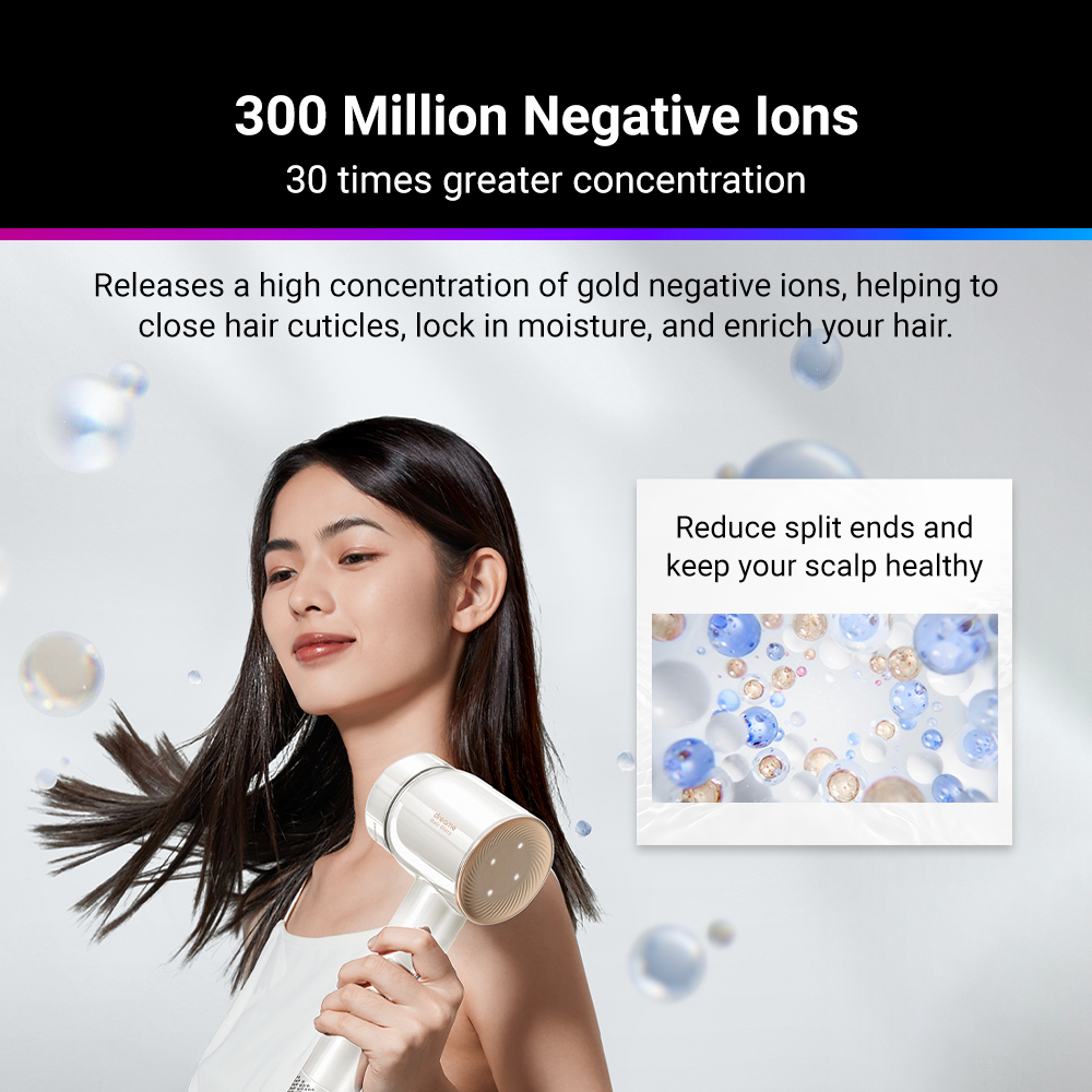 Releases a high concentration of gold negative ions, helping to smooth hair and lock in the moisture, making it silky and elegant.