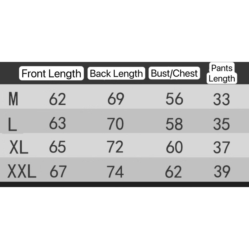 M: Front length-62cm, Back length-69cm, Bust: 48cm across, shorts length-33cm