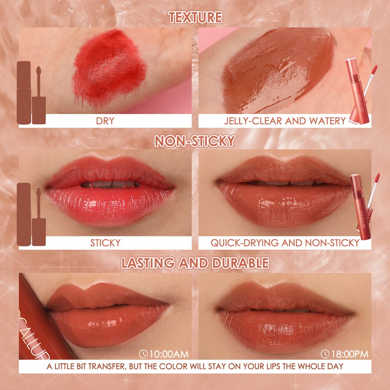 【Jelly-Clear Dewy Texture】Jelly-clear dewy texture, watery and forming a film, contains vitamin E to nourish the lips, can make your lips instantly full of gloss, and easily get a bouncy lips finish