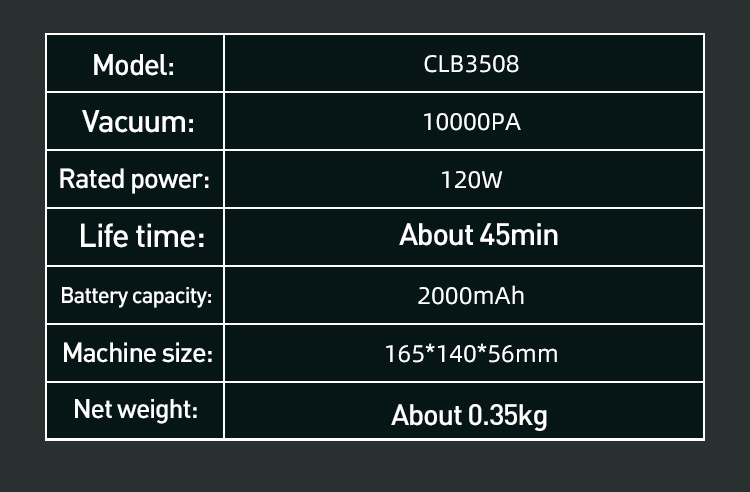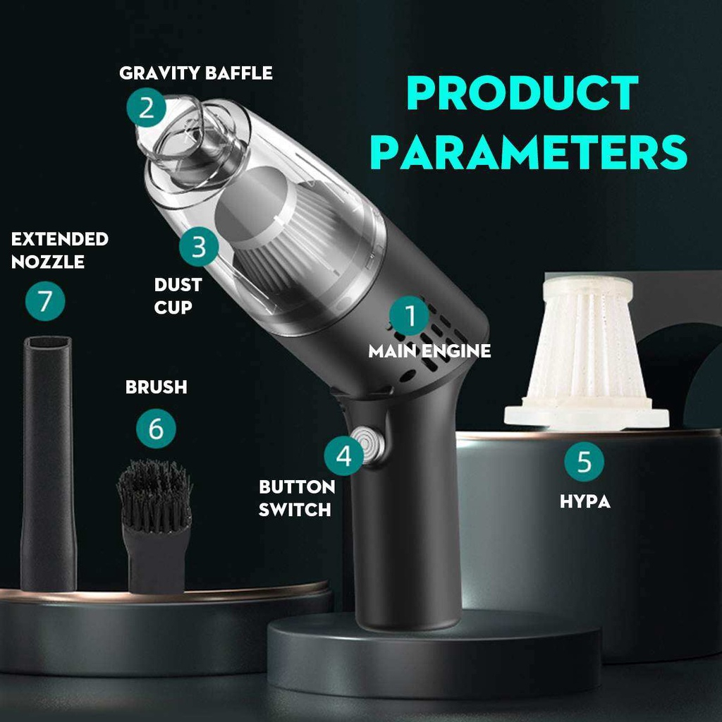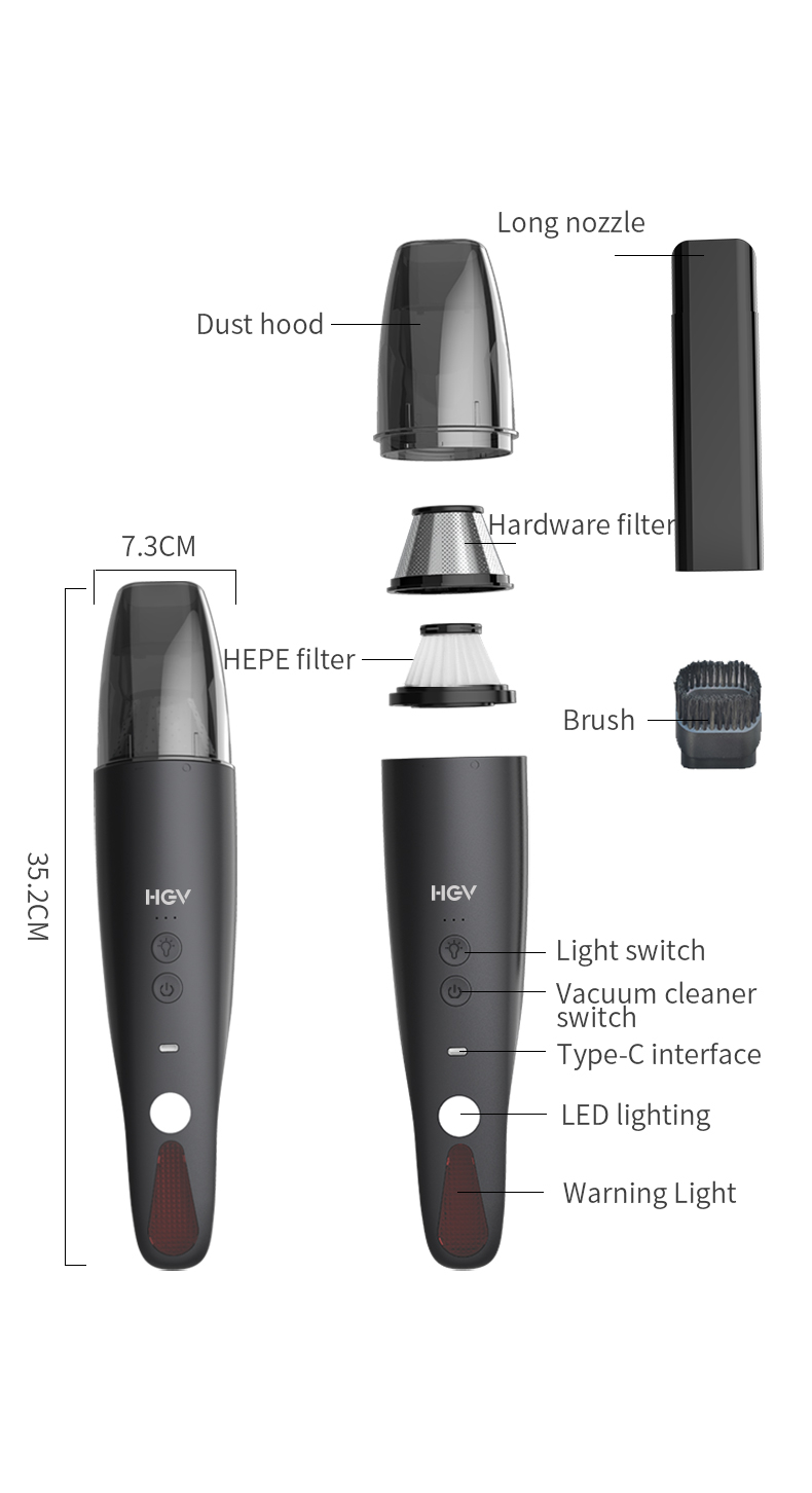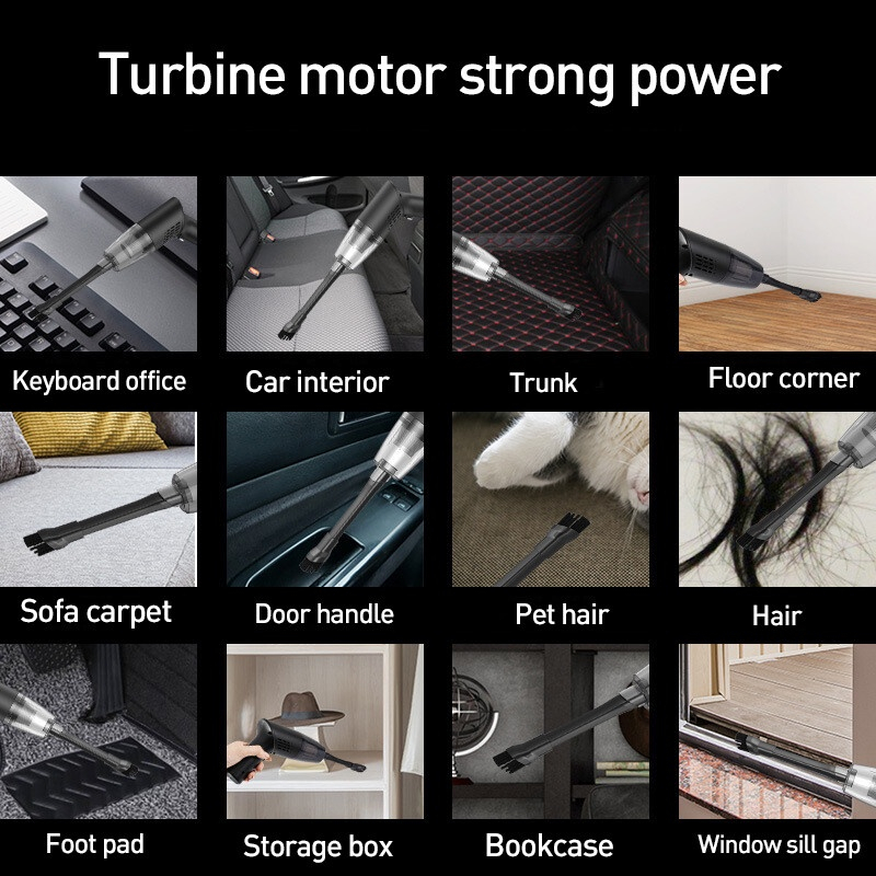 Packing Includes:1 x Car Vacuum Cleaner/1 x Extended suction head/1 x Brush suction head/1 x Type-C Charging cable