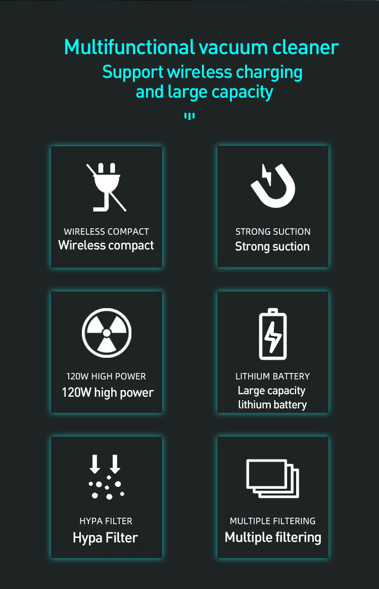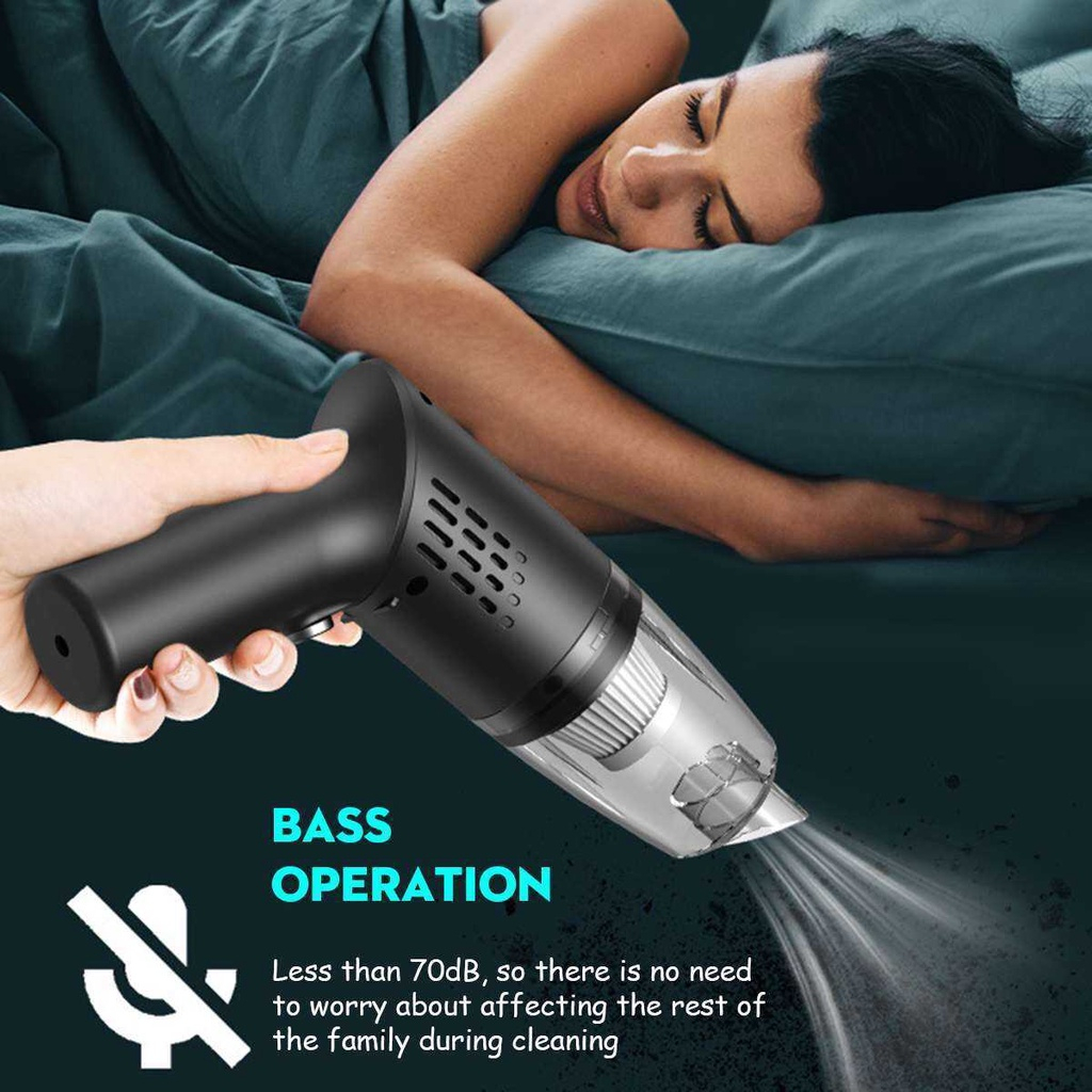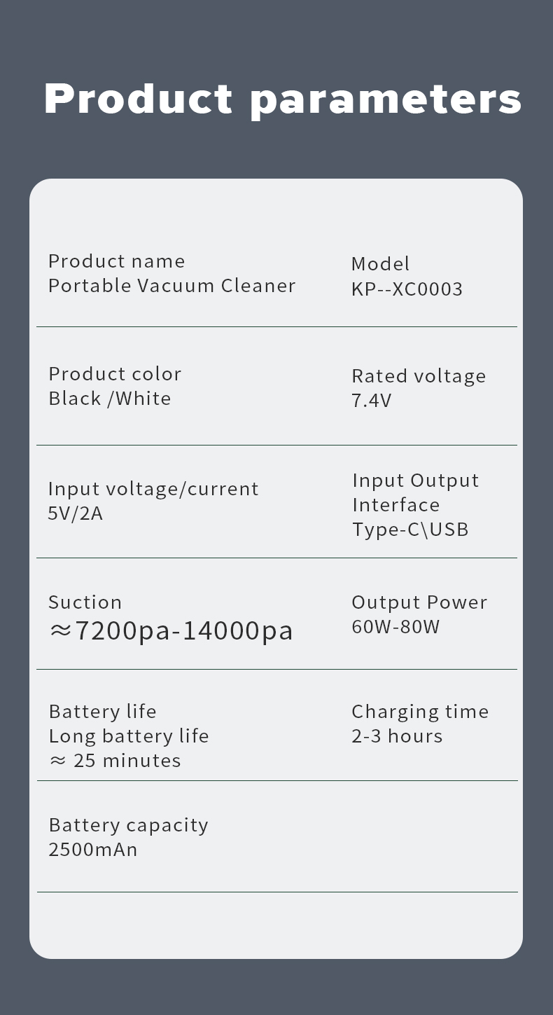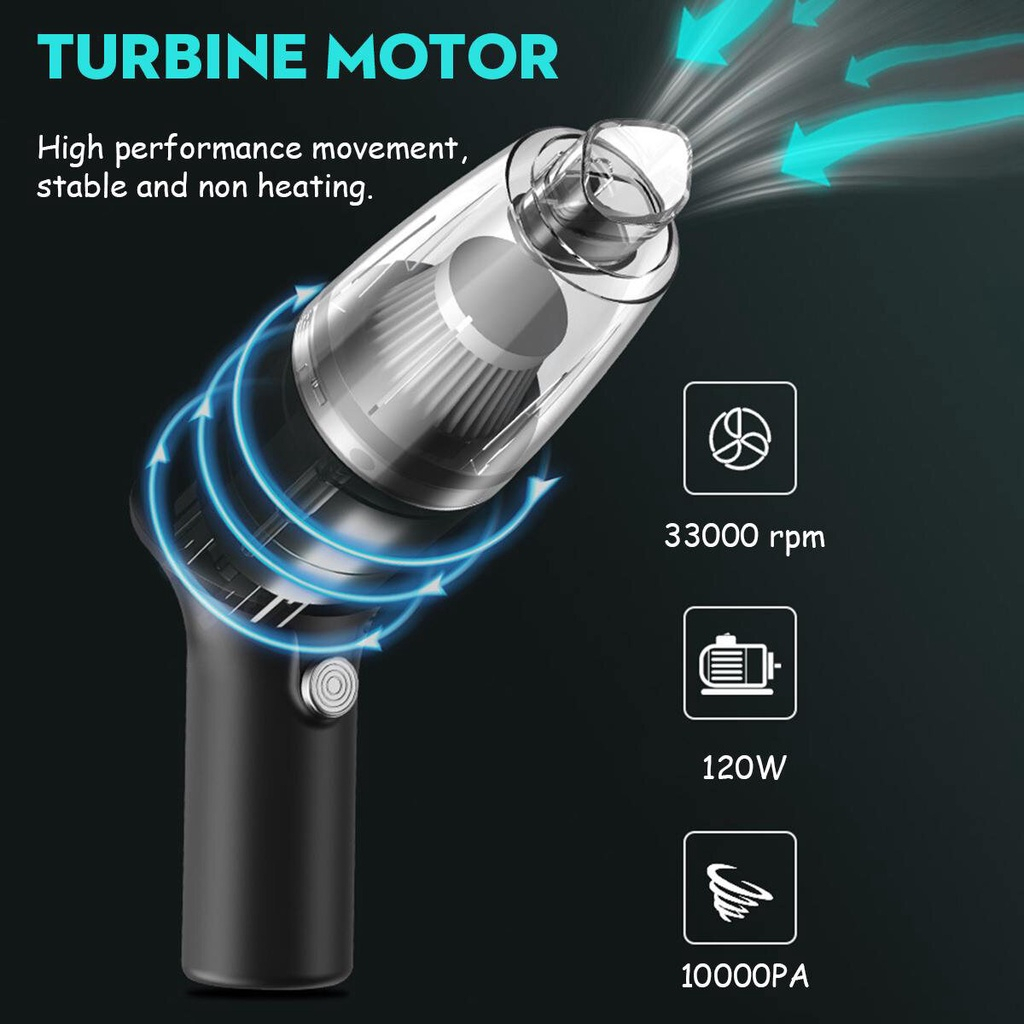 Packing Includes:1 x Car Vacuum Cleaner/1 x Extended suction head/1 x Brush suction head/1 x Type-C Charging cable