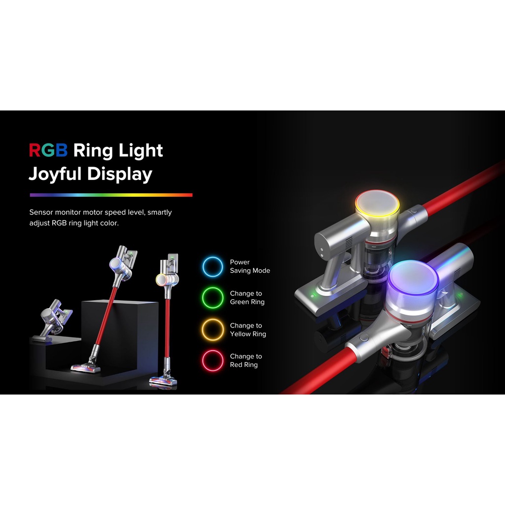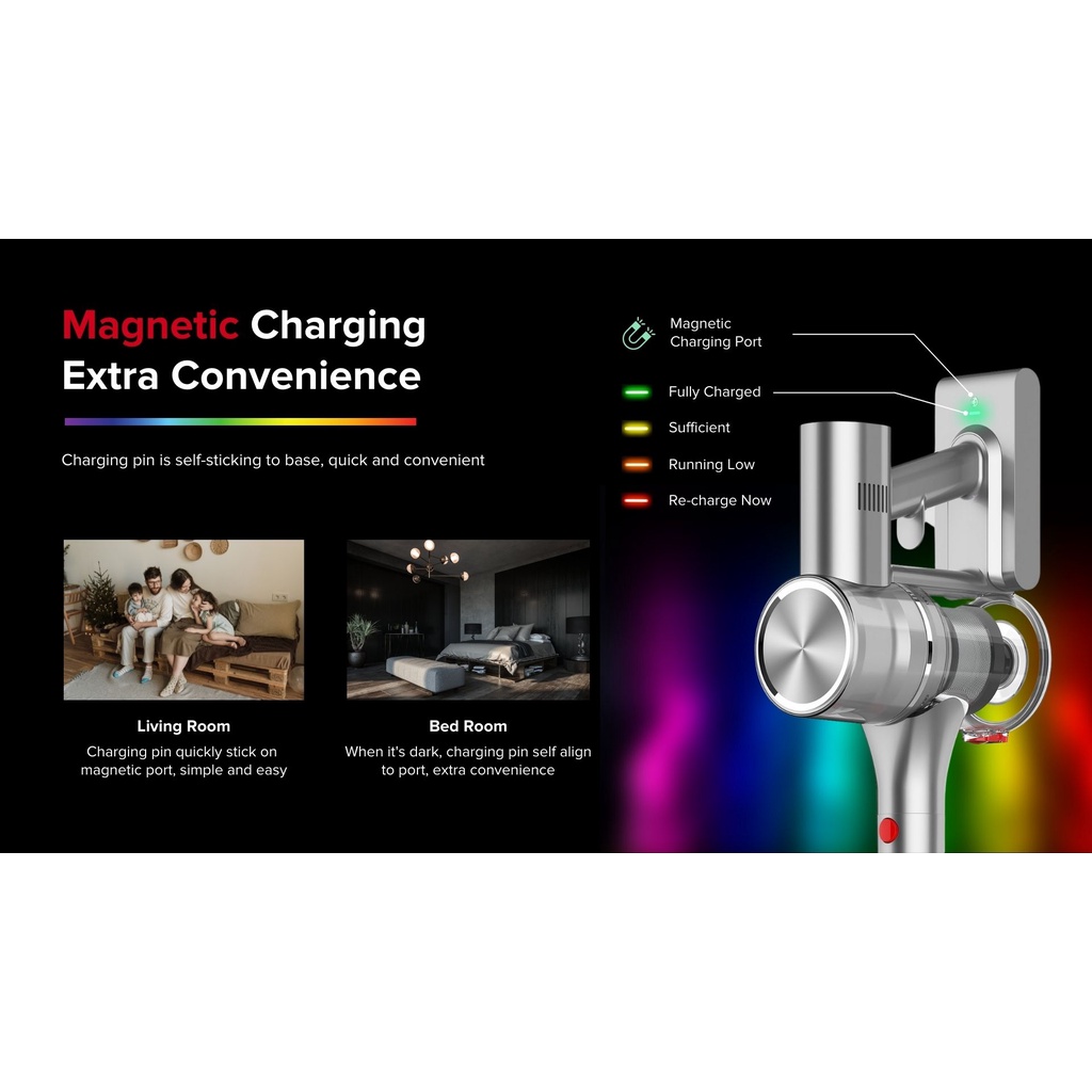 Ambient colorful RGB LED provides a joyful, relaxing home cleaning experience. Ring light color smartly changes between blue, green, yellow, red when vacuum speed is adjusted or different dust amount is detected. New magnetic charging port can be quickly released, locked, self aligned with charging port, experience hassle free re-charging.